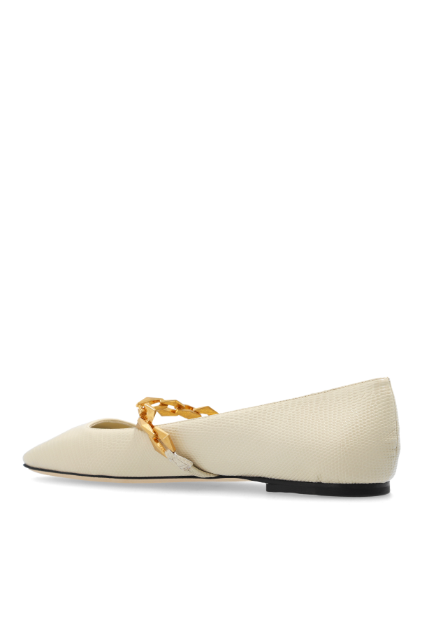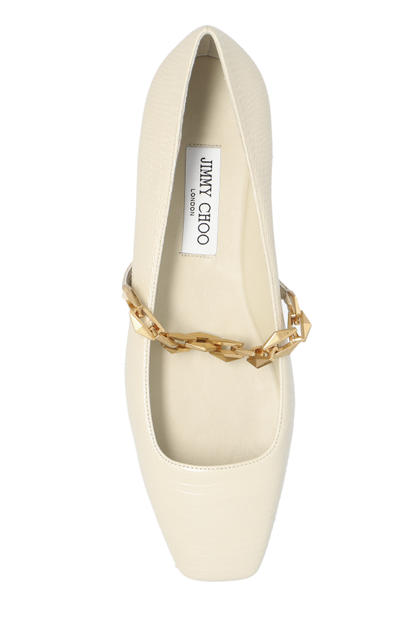 Introducing the \"Diamond\" ballet flats by the renowned designer Jimmy Choo, a testament to luxury and refined taste. Crafted from premium calfskin leather with a delicate texture, these cream-colored flats epitomize elegance and durability. The pièce de résistance is undoubtedly the gold chain embellishment adorning the shoe\'s upper, lending an air of exclusivity and sophistication to the wearer. The one-piece construction, coupled with a flat sole and rounded toe, ensures comfort without compromising on style, making these flats a versatile addition to any wardrobe. Whether paired with jeans for a casual day out or complementing a more formal ensemble, the \"Diamond\" flats elevate any look with their understated allure. A glimpse inside reveals a branded insole bearing the Jimmy Choo name, a hallmark of quality and luxury in the fashion world. These ballet flats are not just shoes; they are a statement of elegance and a testament to the craftsmanship synonymous with the Jimmy Choo brand. Why Purchase the \"Diamond\" Ballet Flats? Exquisite calfskin leather construction promising longevity and comfort. Unique gold chain embellishment adds a touch of glamour and distinction. Versatile design that pairs seamlessly with both casual and formal attire. Signature Jimmy Choo branding, an emblem of luxury and high fashion.