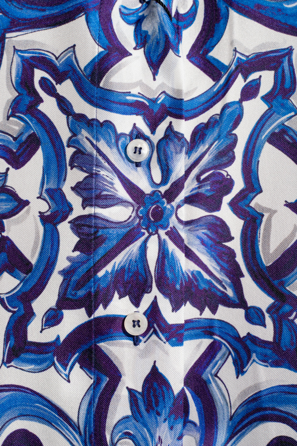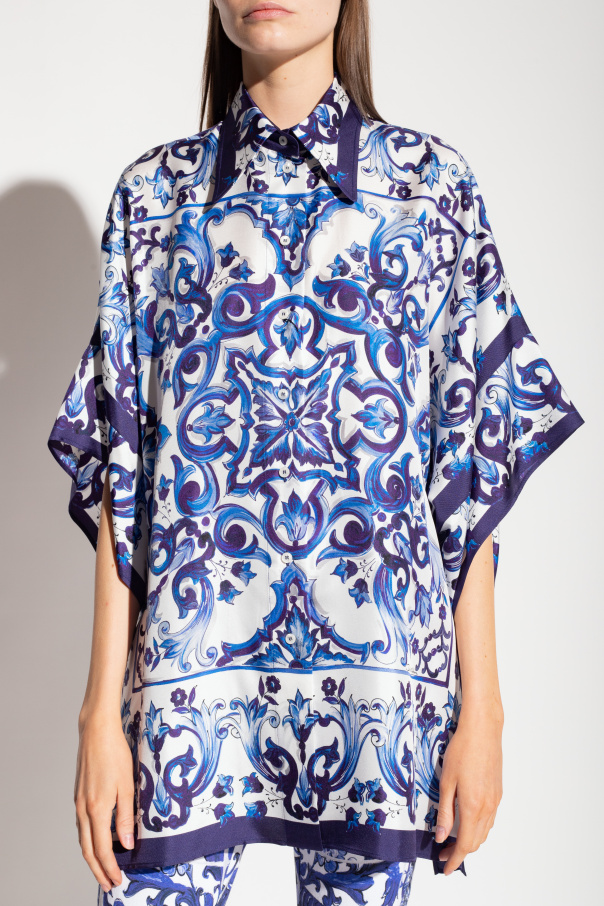 Blue and white shirt from Dolce & Gabbana, the ‘Blu Mediterraneo’ collection. Made from silk with an oversize silhouette, this style showcases a Mediterranean floral print inspired by majolica tiles, button fastenings and short sleeves.