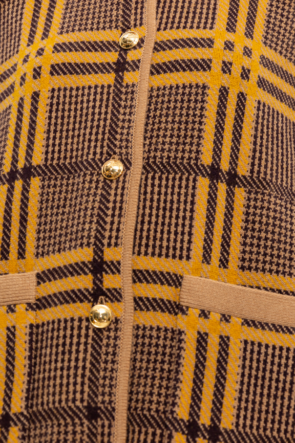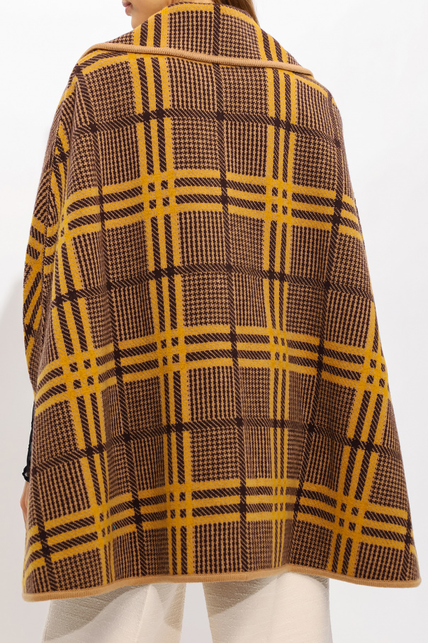Reversible poncho in beige, brown and orange from Gucci. Made of wool, this garment features decorative buttons, check pattern, two slip pockets and lining with a monogram pattern.