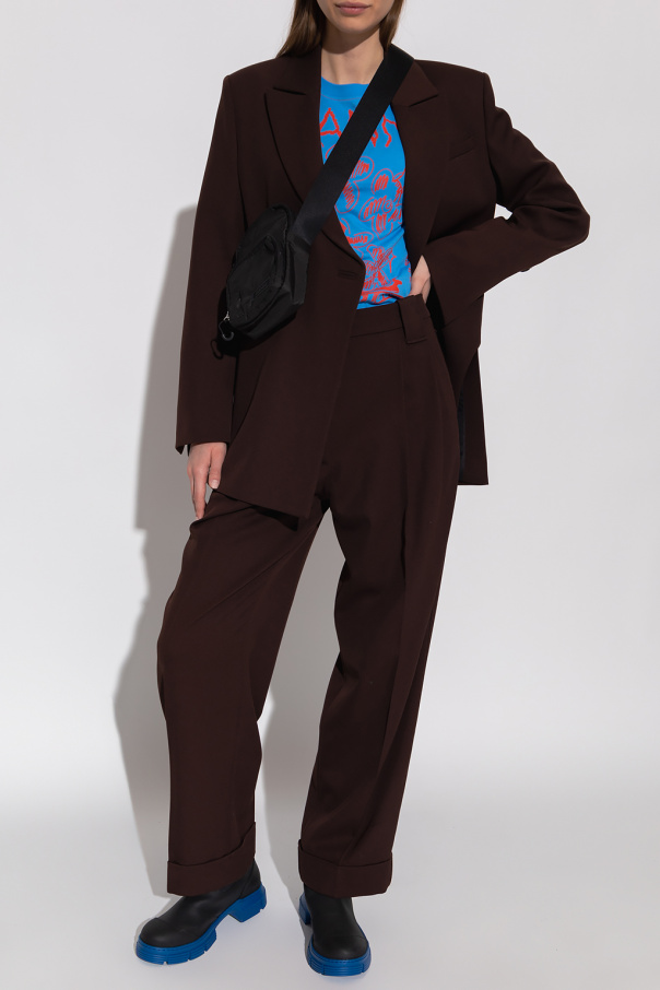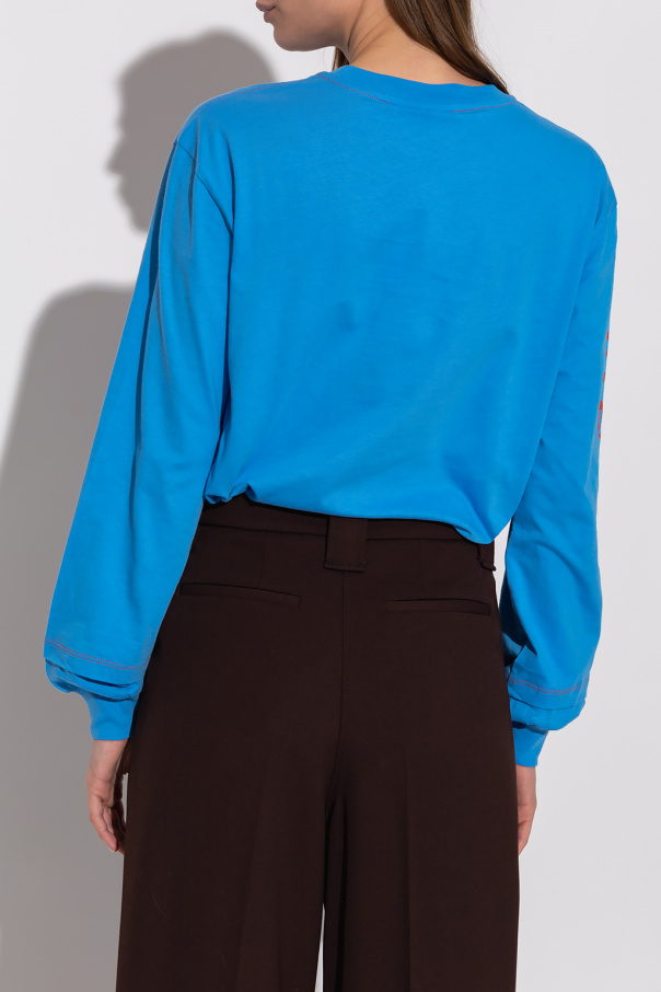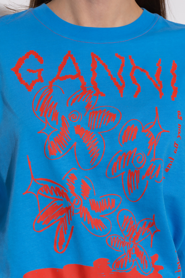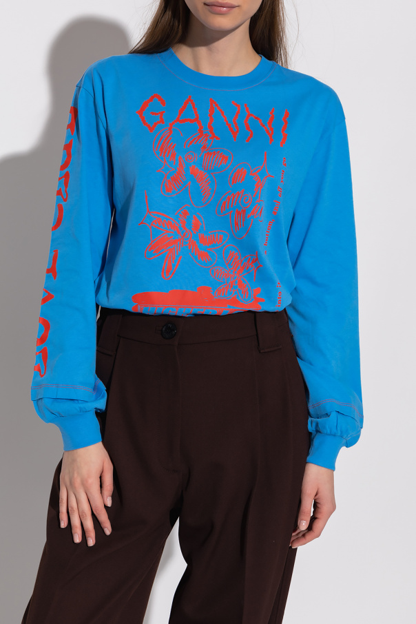 Blue crewneck T-shirt from Ganni. Crafted from organic cotton, this style features long sleeves with elasticated cuffs, double-layered hem detailing and a red graphic print with a ‘HIGHER LOVE’ logo.