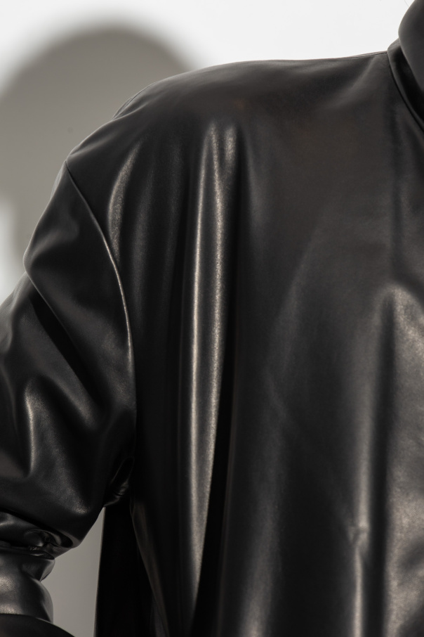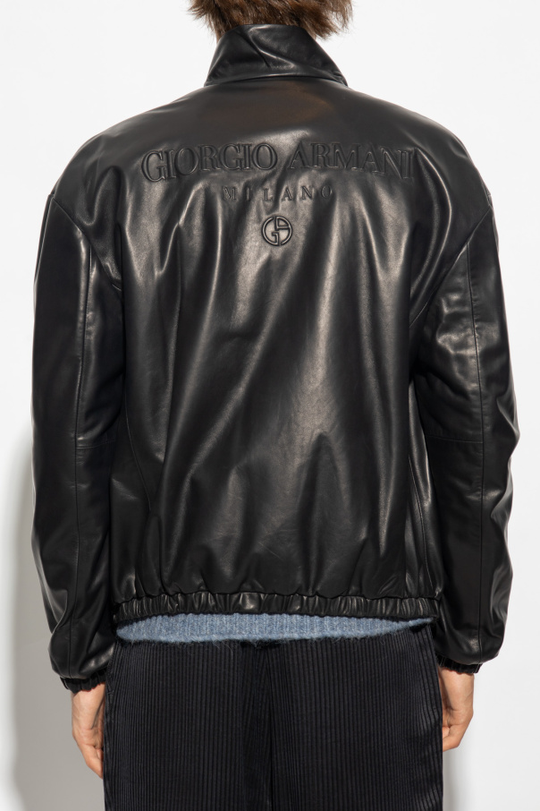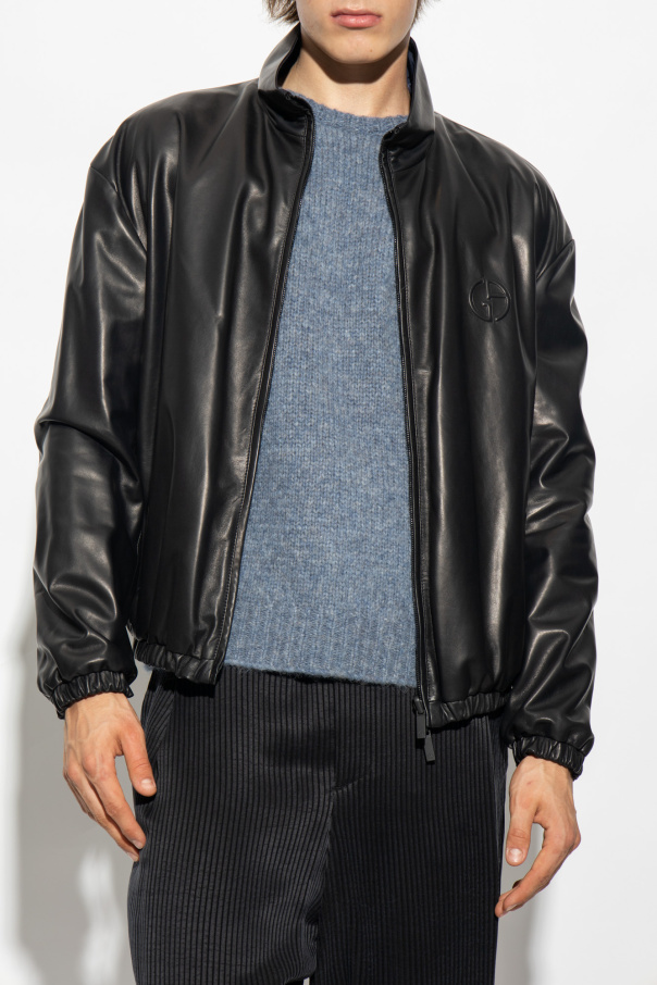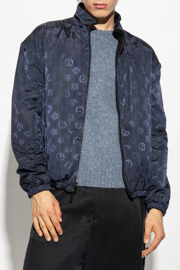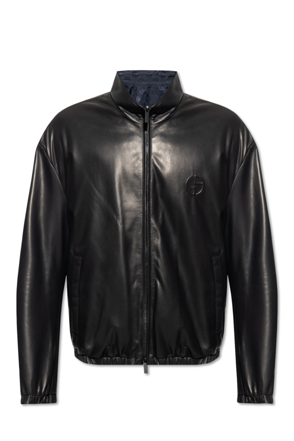 Reversible jacket from Giorgio Armani. Fastened with a two-way zipper, this style features a standing collar and ribbing on the bottom hem and long sleeves. One side is made of lamb leather in black and showcases a tactile logo and two snap-fastened pockets. The other side is navy blue and has a monogram pattern and two zip pockets.