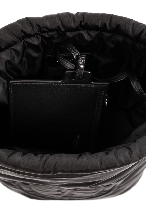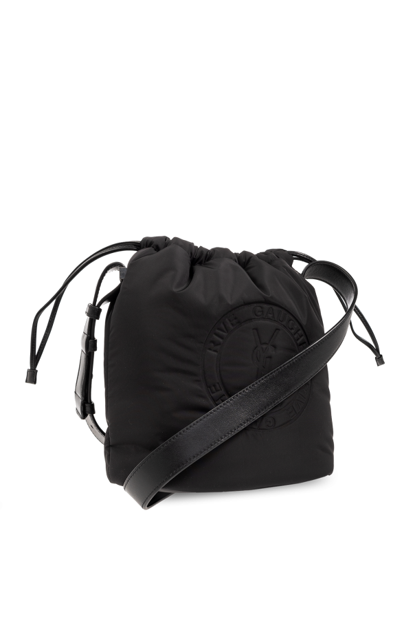 Black ‘Rive Gauche’ bucket shoulder bag from Saint Laurent. Made of ECONYL®, this design cinches closed with drawstrings and showcases an embossed logo on the front, calf leather trims, an adjustable shoulder strap, silver-tone metal hardware and one internal compartment with a branded zip pouch on a strap.