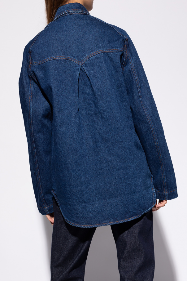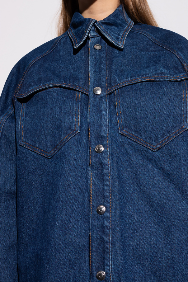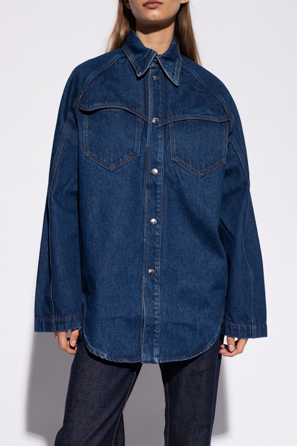 Blue denim shirt from Nanushka. Crafted from organic cotton with an oversize silhouette, this style features silver-tone press-stud closures, colourful stitching and two slip pockets.