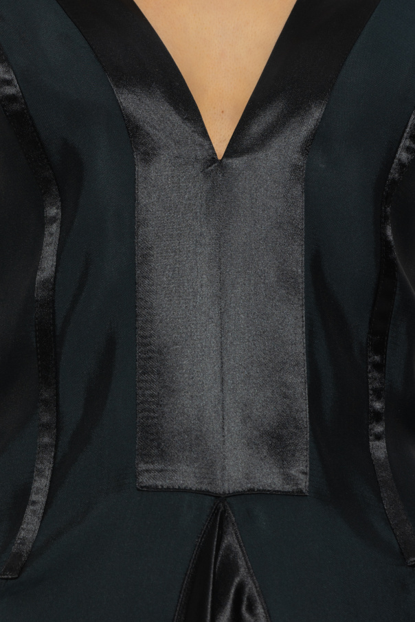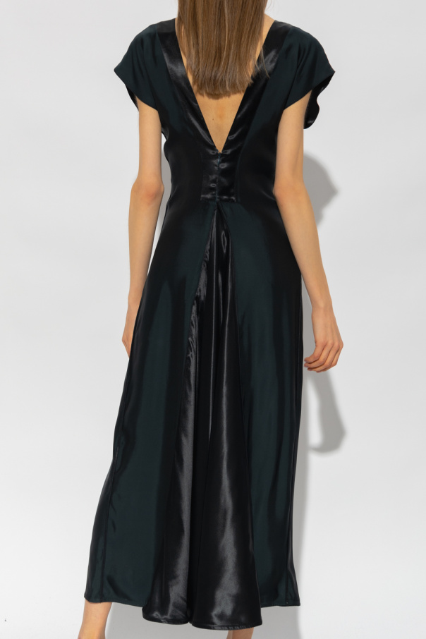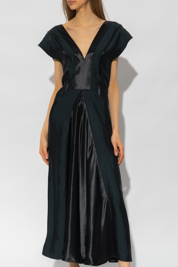 Dark green and black sleeveless dress from Bottega Veneta. Fastened with a back zip and hook, this flared design has a plunging V-neck.