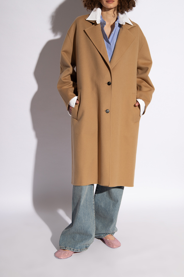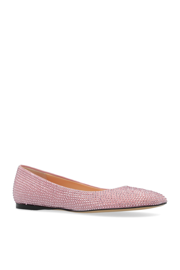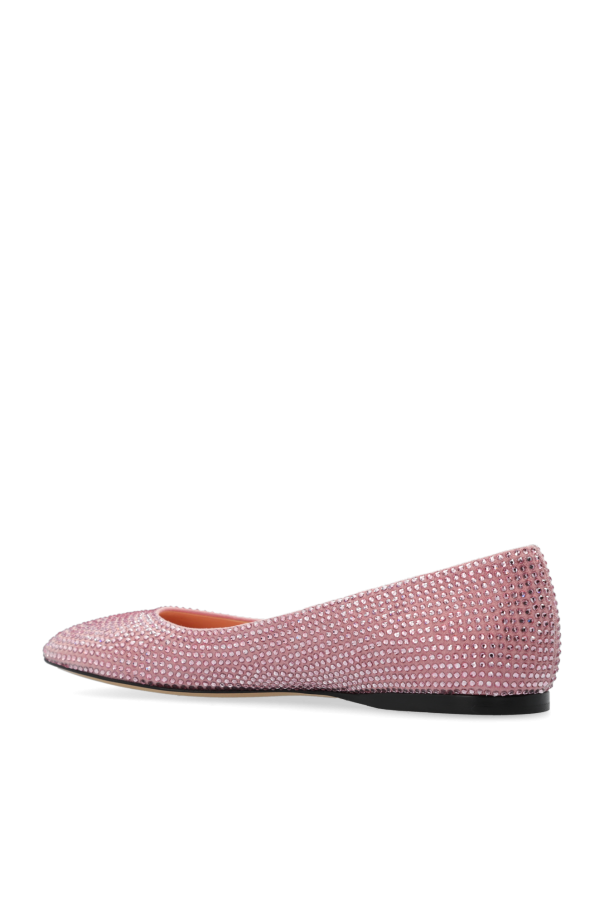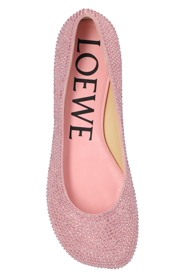 Pink ‘Toy’ ballet flats from Loewe. Made from suede and entirely spruced up with sparkling rhinestones, this model features a beige leather sole and an asymmetrical toe.