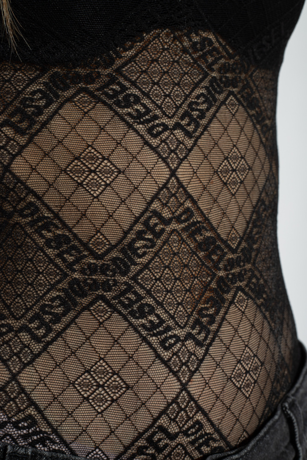 Black ‘UFBY-BRILLY’ lace body from Diesel. Fastened with snap buttons, this long sleeve design features decorative stitches in red and a turtleneck.