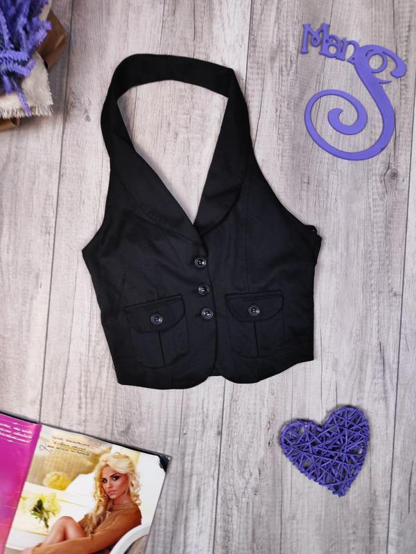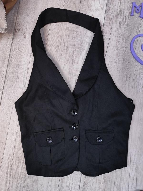 Новый школьный жилет для девочки Kas kids. Черный жилет на пуговицах. Короткий с воротником-хомутом. Два накладных кармана на пуговицах.