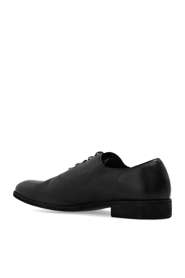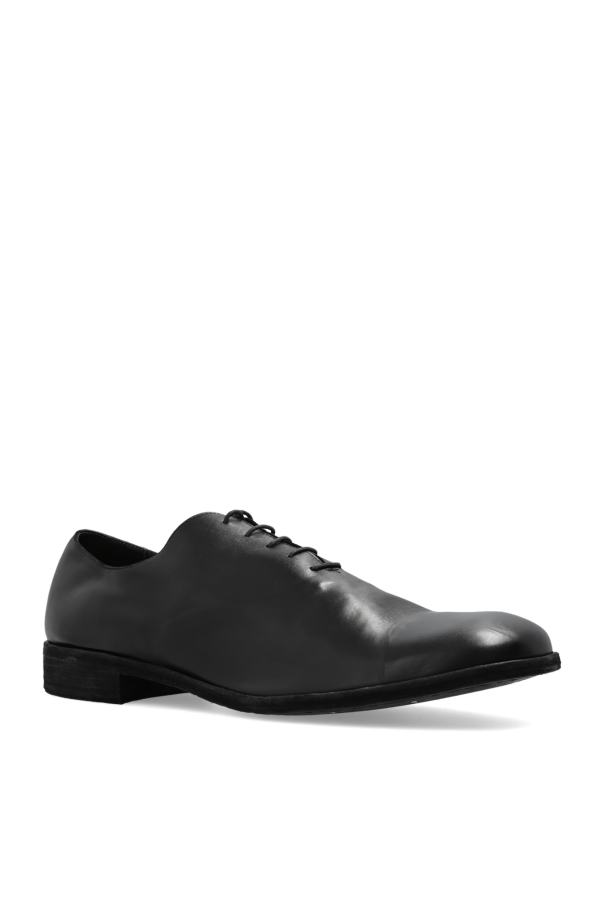Black shoes from Petrosolaum. Crafted from naturally dyed calf leather characterized by its subtle texture and transparency due to semi-aniline finish. Manufactured using the McKay method, in which the insole, the instep leather, and the outsole are sewn all at once after being put into a wooden pattern. Sitting on a black leather sole, this lace-up model features a round toe. It\'s made from a single piece of leather, so that copies may differ slightly from each other and have naturally occurring roughness and minor flaws.