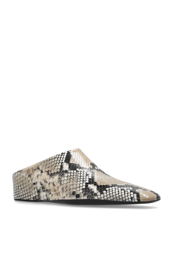 Introducing the exquisite JIL SANDER Beige and Black Wedge Sandals, a testament to avant-garde design and unparalleled craftsmanship. Fashioned from premium leather that mimics the intricate patterns of reptilian skin, these sandals embody the perfect balance of elegance and edginess. The dominant beige hue, accentuated with a black animal motif, creates a captivating visual allure, making these sandals a standout piece in any exclusive wardrobe. The sandals feature a gently rounded, square toe and an open back, ensuring ease of wear while maintaining a chic silhouette. The flat wedge design not only enhances the aesthetic appeal but also promises uncompromised comfort, making them suitable for both casual and more formal ensembles. The black leather and rubber sole further accentuates the sophisticated look while providing durability and slip resistance. A distinctive detail that sets these sandals apart is the designer\'s logo, elegantly placed on the insole. This emblem of luxury, set against a black background, subtly communicates the exclusivity of the JIL SANDER brand. Why Should You Purchase These Sandals? Expertly crafted from high-quality leather, offering both style and longevity. Unique beige and black design with an animal motif for an eye-catching look. Comfortable yet elegant flat wedge heel suitable for various occasions. Emblazoned with the prestigious JIL SANDER logo, highlighting the designer\'s exquisite attention to detail.