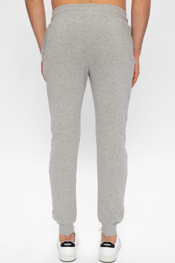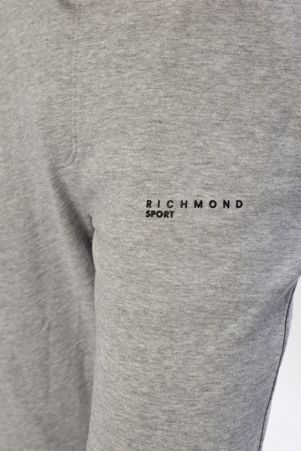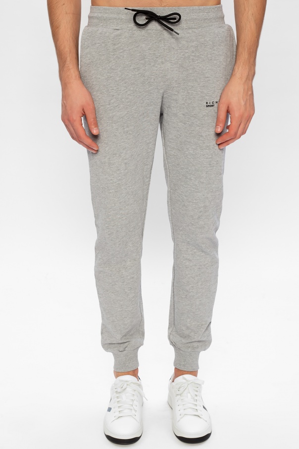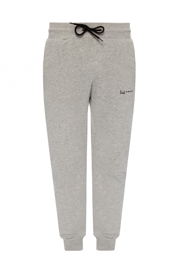 Grey sweatpants from John Richmond. Crafted from cotton, this design features drawstring fastening, two front slip pockets, black logo print and ribbed cuffs.