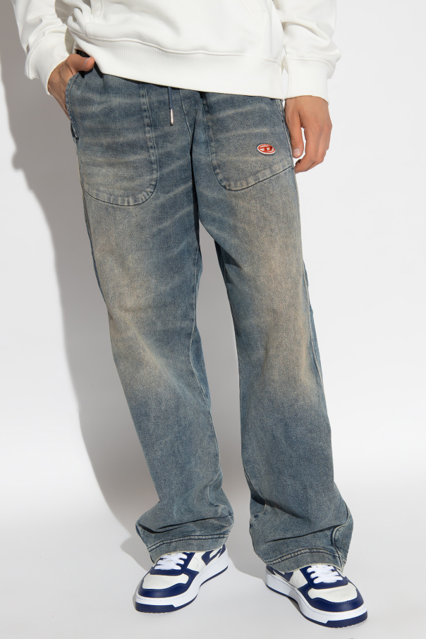 Blue and beige ‘D-MARTIANS-NE’ jogger jeans from Diesel. This straight leg pair features an elastic drawstring waistband, worn effect and three slip pockets.
