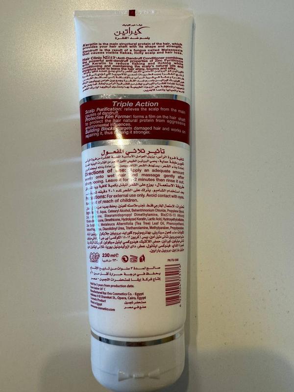 Кератин – это основной структурный белок волос, который придает стержню волоса форму и прочность. Перхоть является результатом грибка Malassezia, который вызывает видимые шелушения, зуд кожи головы и выпадение волос. Увлажняющий кондиционер против перхоти Hair Clinic eKeratin сочетает в себе мощные противоперхотные свойства пиритиона цинка и кератина, которые уменьшают шелушение и зуд, одновременно кондиционируя и поддерживая уровень натуральных масел и влаги кожи головы, делая волосы блестящими, упругими и шелковистыми.