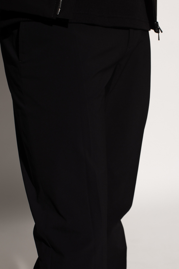 Black trousers from Theory. Fastened with a zip, hook and button, this pair falls down with slightly tapered legs and is complete with two front pockets and two buttoned back pockets.