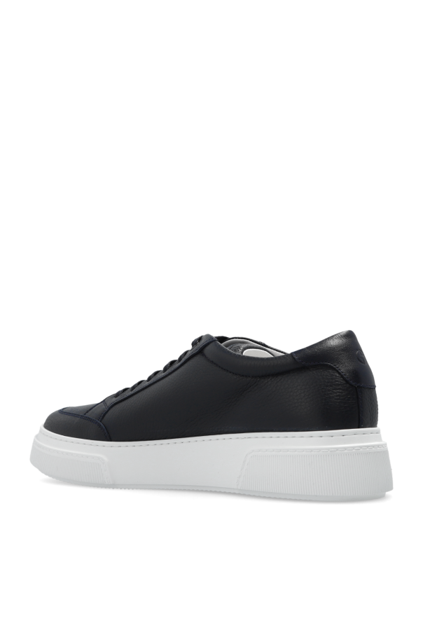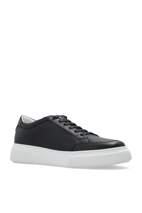 Navy sneakers from Giorgio Armani. Made of leather, this lace-up pair features an embossed logo and white rubber sole.