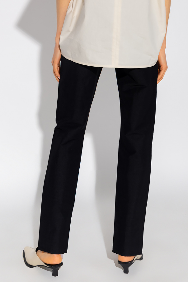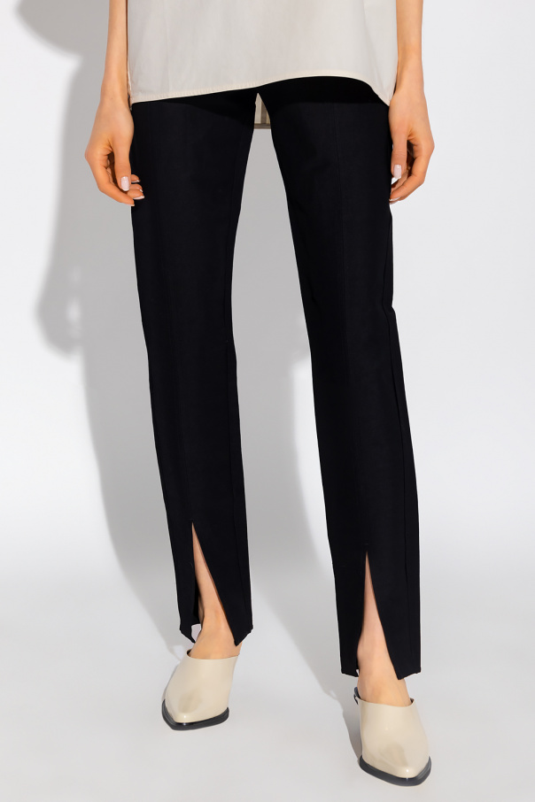 Black skinny trousers from Toteme. Crafted from a linen blend with a high-waisted silhouette, this pair features a hidden zip closure on the side and tight-fitting legs with slits.