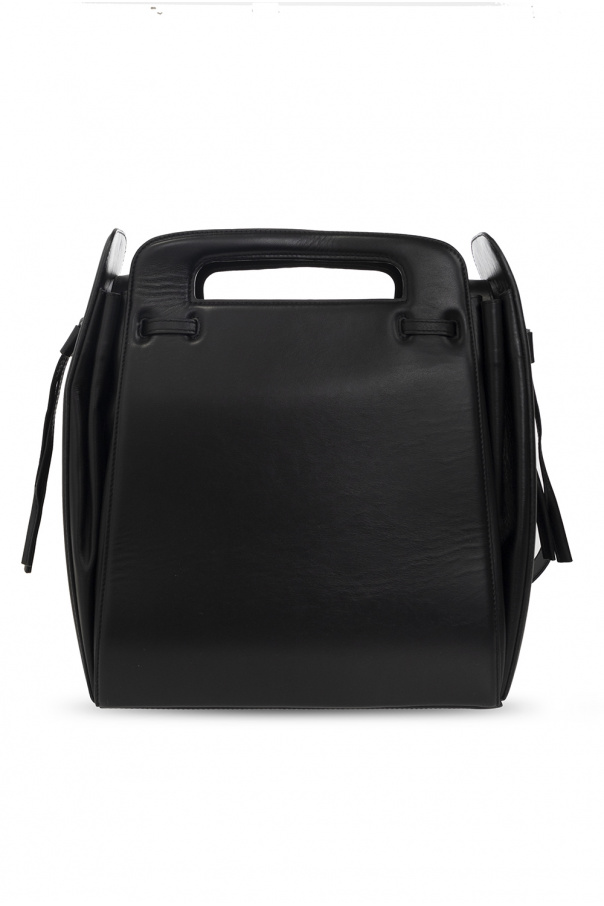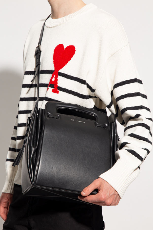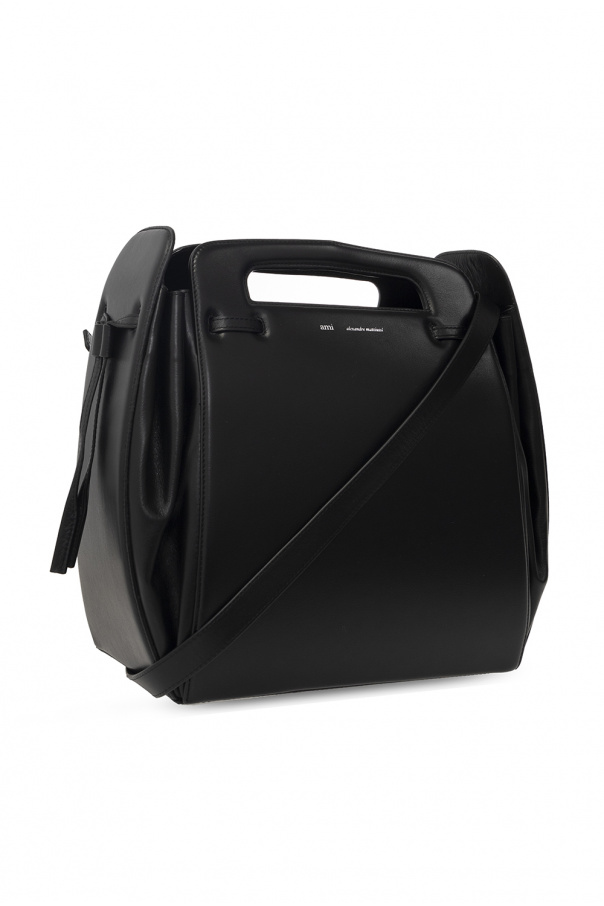 Black shoulder bag from Ami Alexandre Mattiussi. Crafted from cow leather, this design is cinched with drawstrings on the sides and detailed with a magnetic fastener, an embossed logo, two half-round handles, a shoulder strap, silver-tone metal hardware and one internal compartment with a slip pocket.