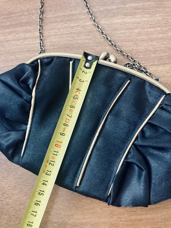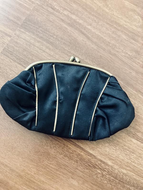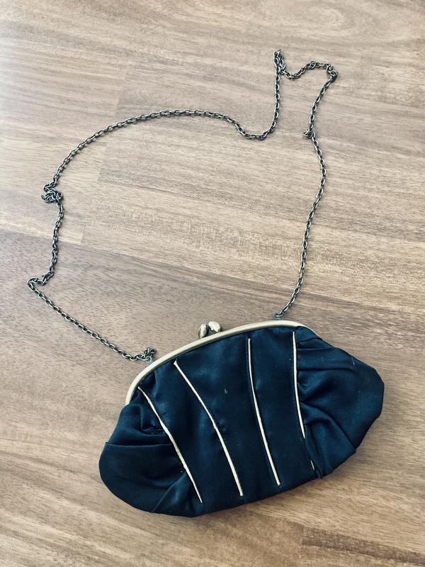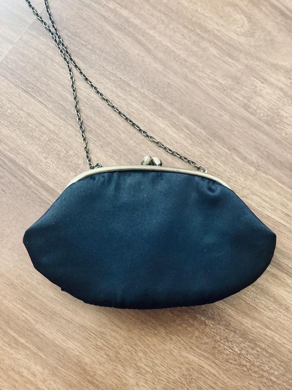 Клатч 14*24см текстильний чорний з золотистими елементами. Є ланцюжок, який можна сховати, можна носити на ньому на плечі.
