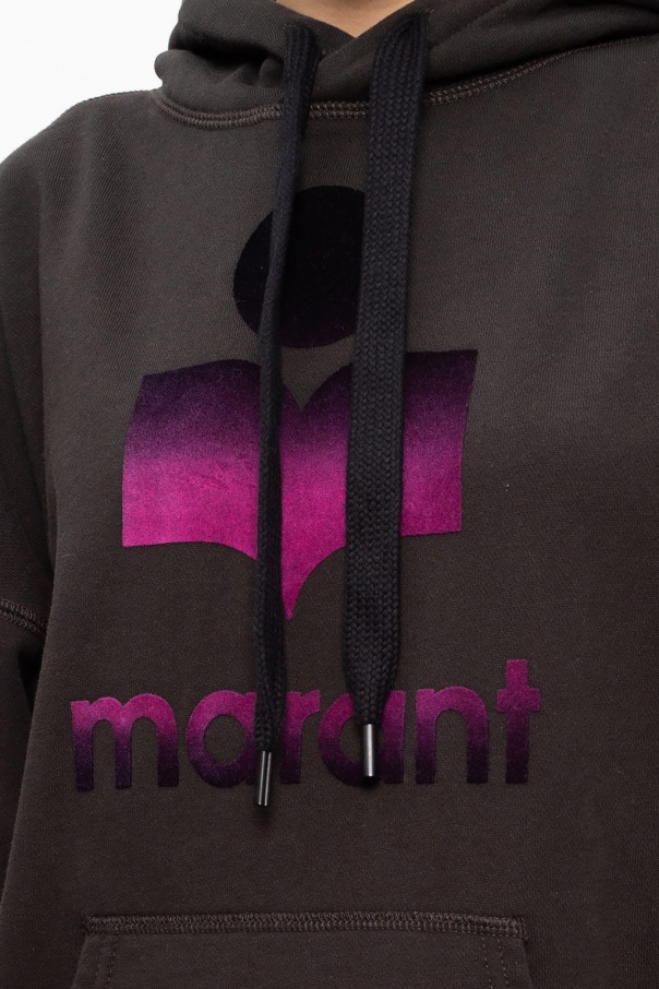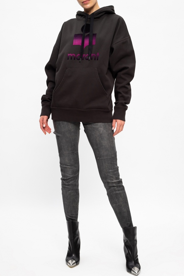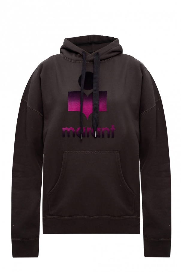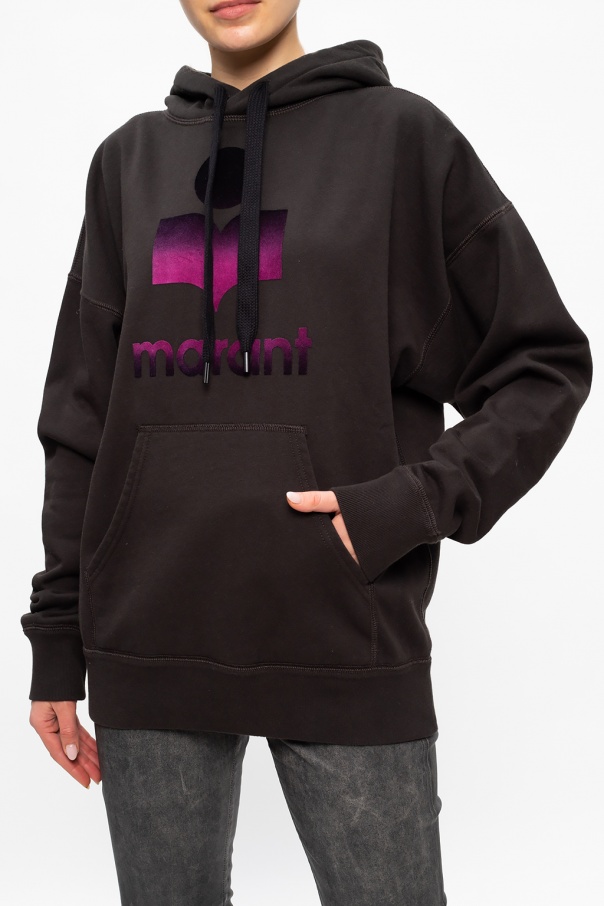Dark grey sweatshirt with a drawcord-adjustable hood from Isabel Marant Étoile. Boasting a black and purple velvet-flocked logo appliqué, this cotton-crafted hoodie is complete with a kangaroo pocket and rib-knit trims.