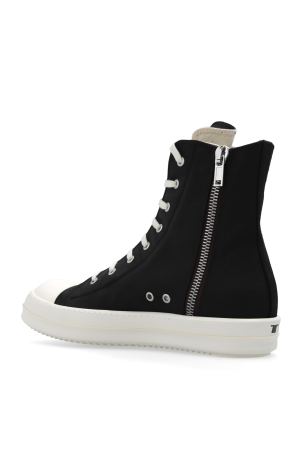 Black ‘Sneaks’ high-top sneakers from Rick Owens DRKSHDW. Made from fabric, this lace-up model sits on a white rubber sole and showcases a side zipper and the brand\'s logo printed in black.