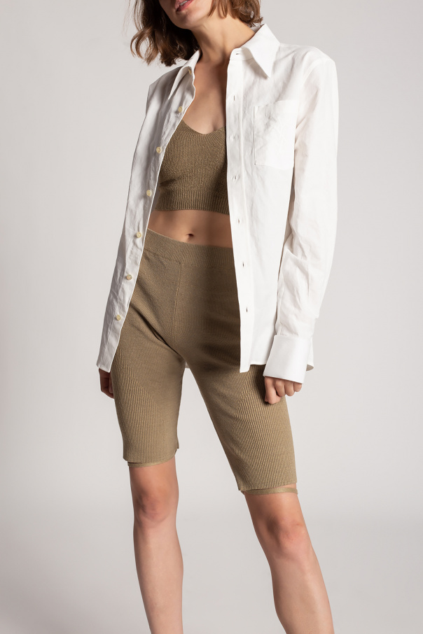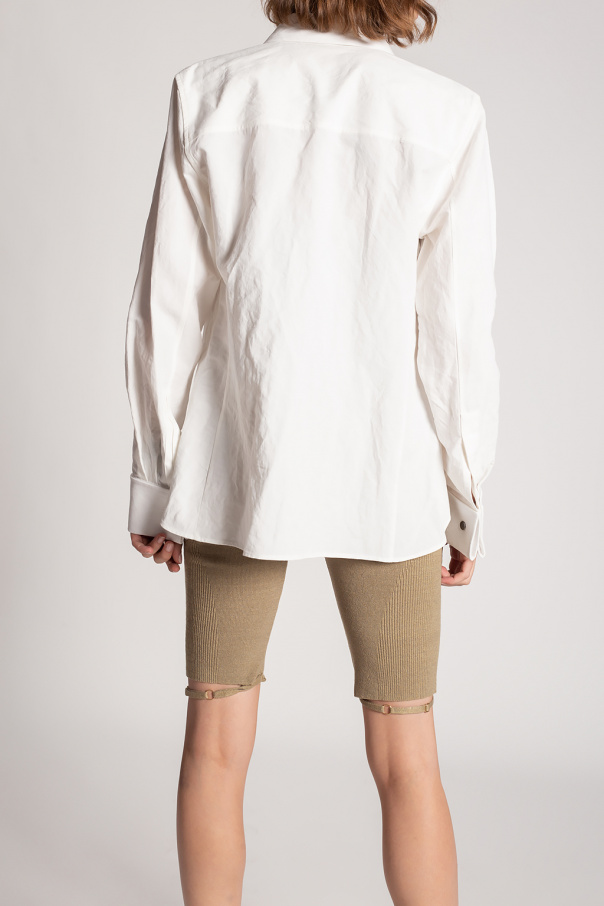 Cream shirt from Saint Laurent. Crafted from a cotton and linen blend, this style fastens via buttons and features long sleeves with button cuffs and a slip chest pocket accentuated with an embroidered logo.