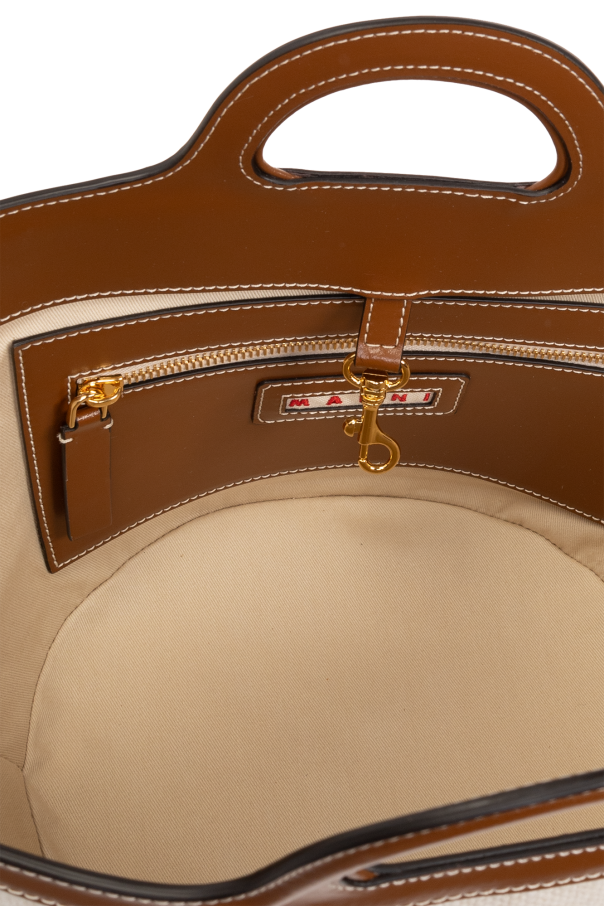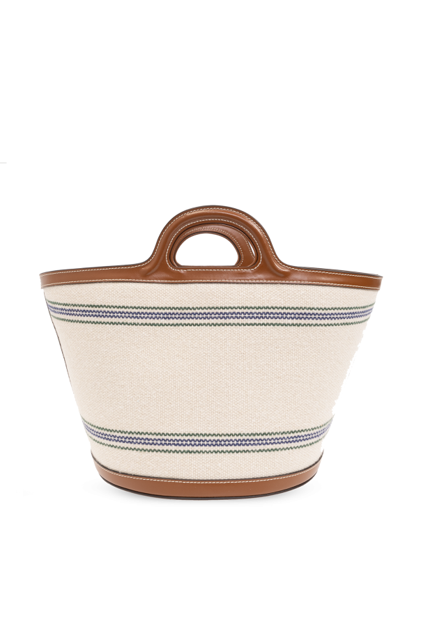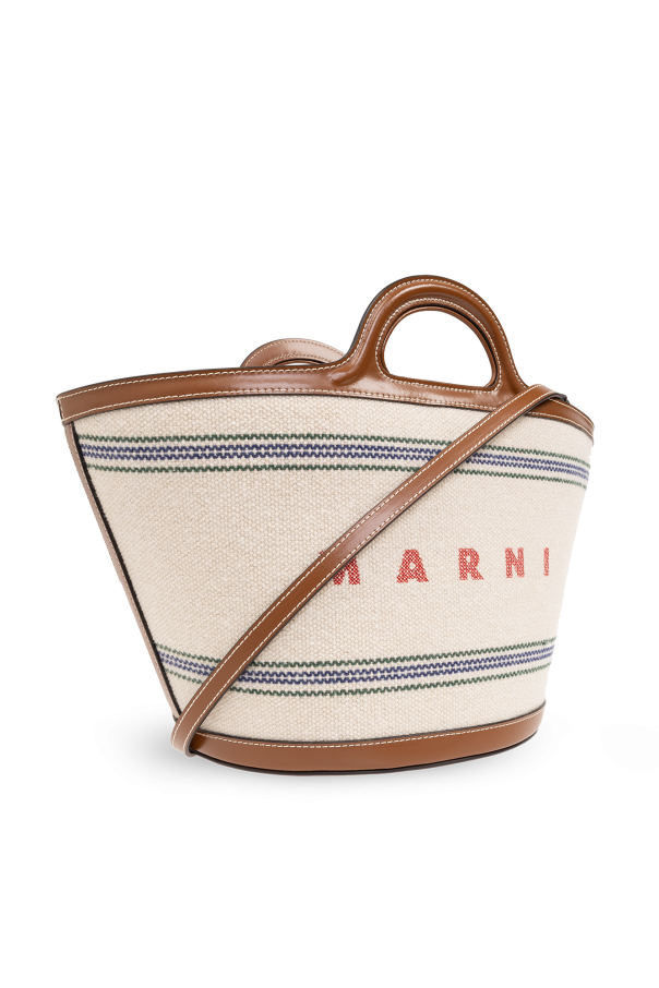 Cream ‘Tropicalia’ shopper bag from Marni. Made of woven raffia with brown calf leather trims, this design features a leather strap, stripe pattern, red logo embroidery, two half-round handles, shoulder strap and one internal compartment with one zip pocket.