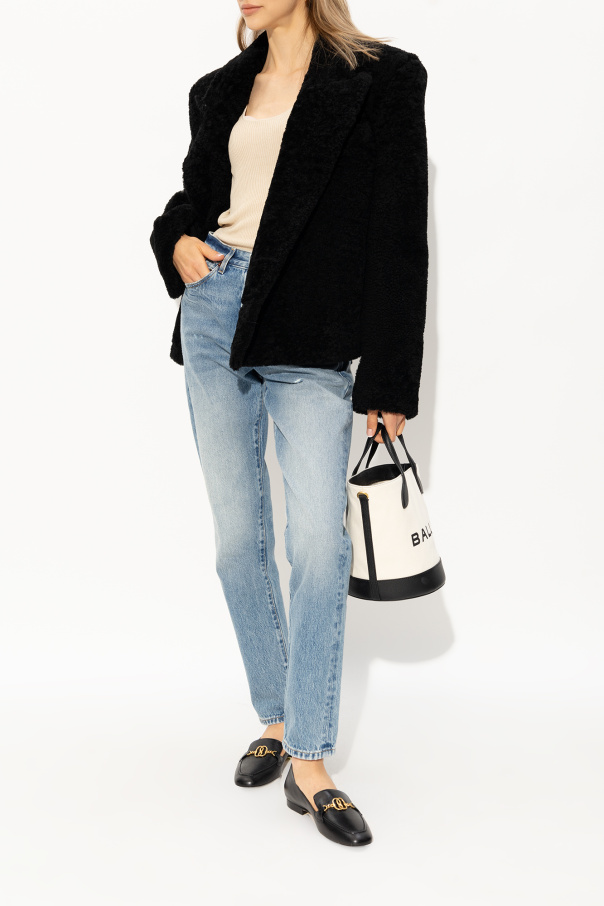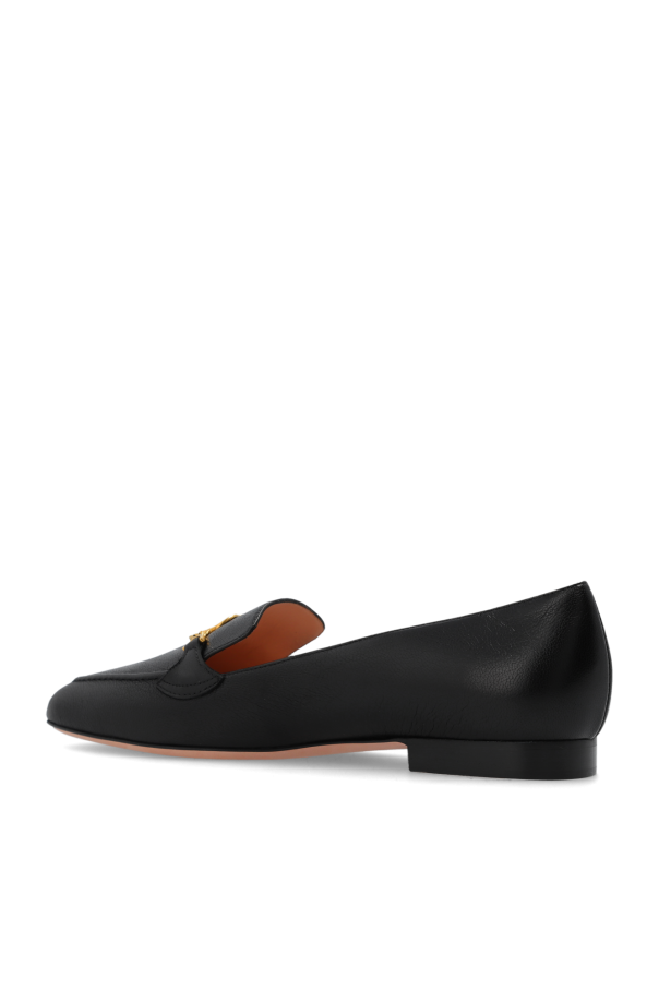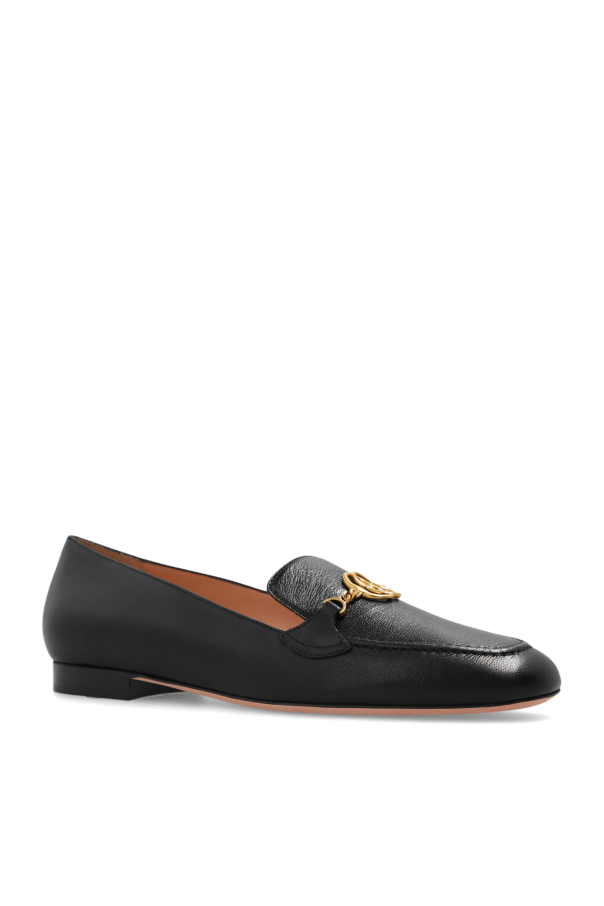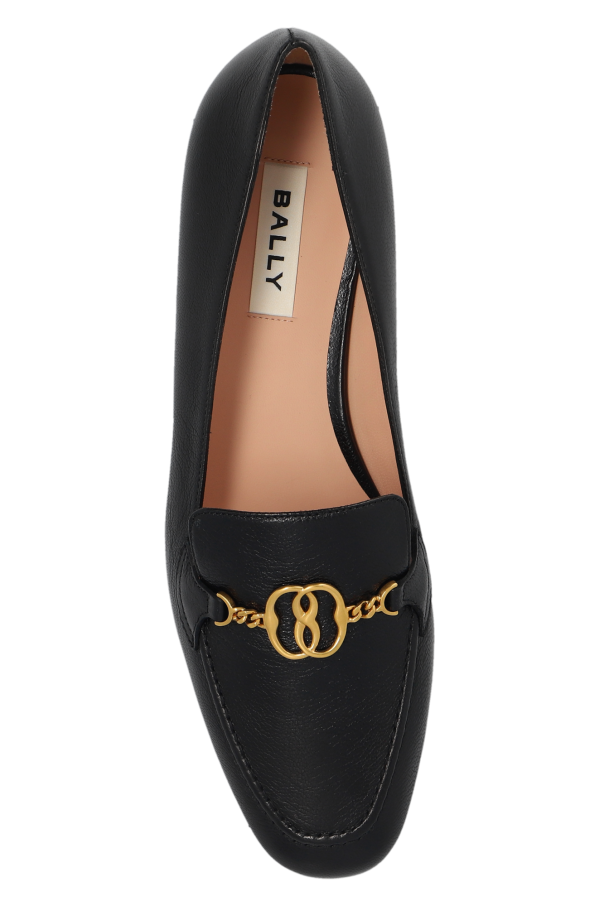 Black ‘Obrien’ loafers from Bally. Made from goat leather, this model sits on a pink and black leather sole and features a gold-tone metal logo plaque on the front.