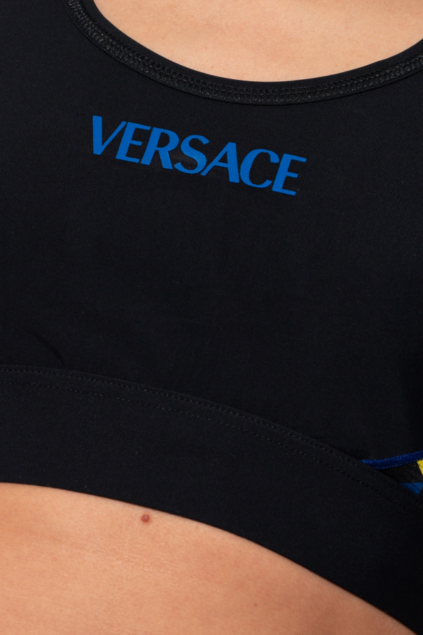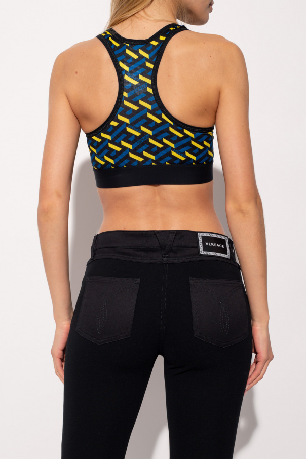 Black training crop top from Versace. This round neck design is decorated with a logo detail and La Greca print.