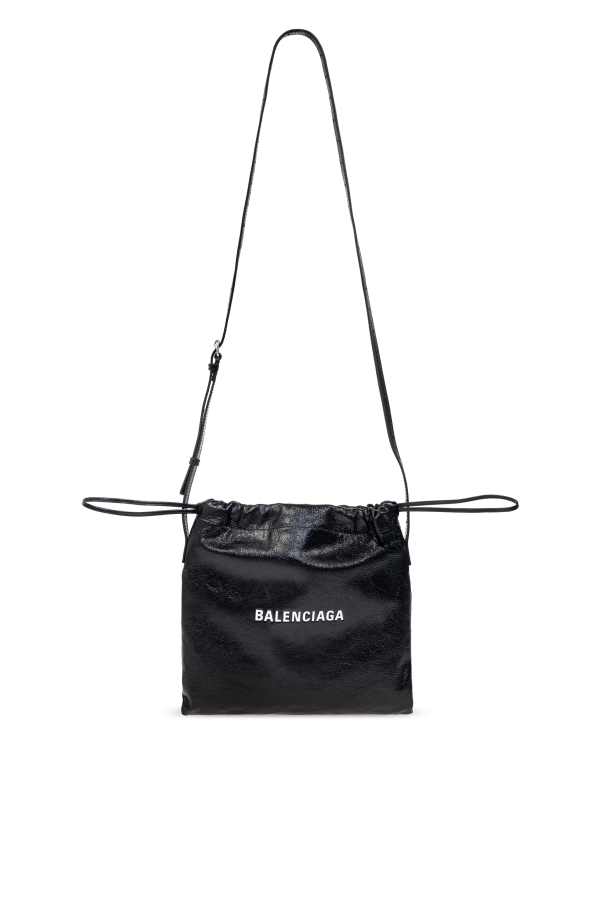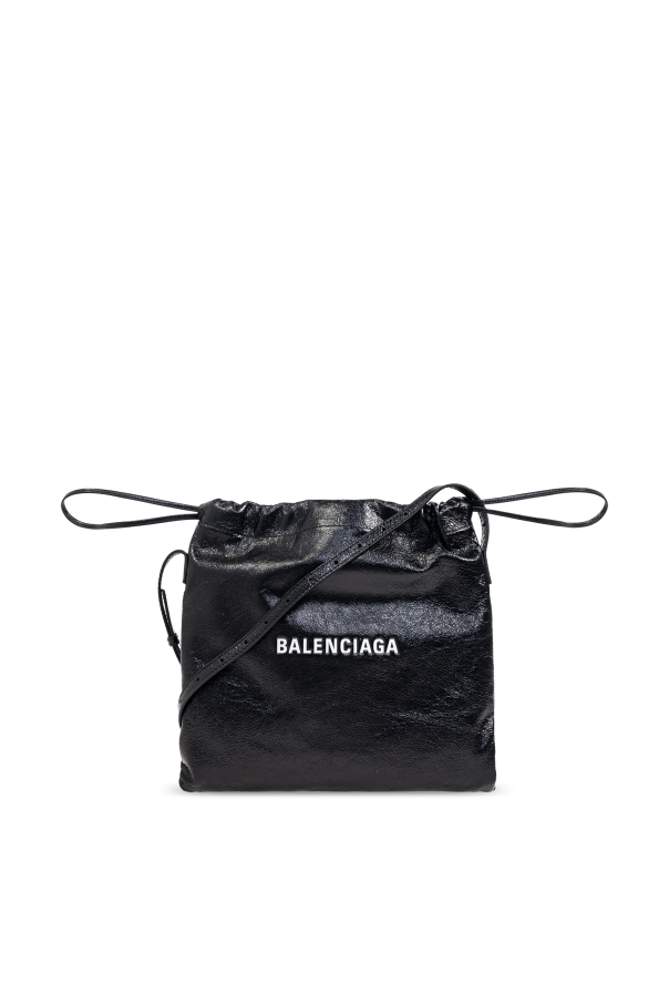 Introducing the Balenciaga Dust Shoulder Bag, a paragon of sophisticated style and functionality. This exquisite piece, rendered in a dominant black hue, boasts a luxurious sheen thanks to its lambskin exterior, expertly paired with a durable nylon interior. The bag\'s rectangular shape and generous size make it a perfect companion for daily endeavors, while its minimalist design, punctuated by the bold white \"BALENCIAGA\" logo, ensures it stands out as a statement accessory. It features a regulatable strap for versatile wear, adapting seamlessly to your style needs. Inside, discover a thoughtfully designed compartment with a zippered partition for enhanced practicality, alongside a drawstring closure for added security. Why Choose This Product? Crafted from premium lambskin for an opulent finish. Spacious design tailored for everyday use. Minimalist aesthetics with iconic branding. Adjustable strap offers versatile carrying options. Secure zip closure with additional drawstring feature.