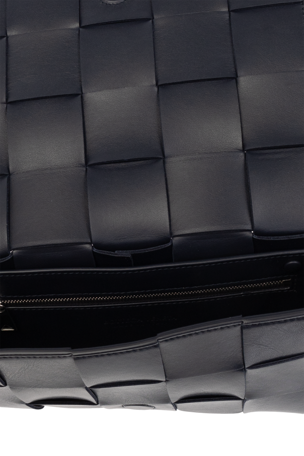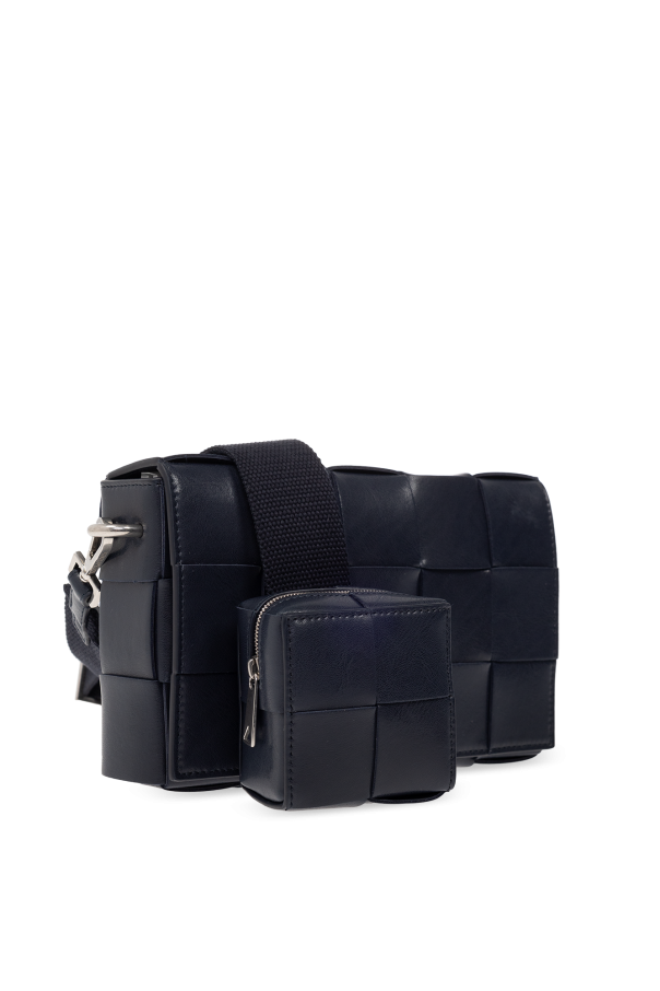 Navy blue ‘Cassette’ shoulder bag from Bottega Veneta. Made of leather with the brand\'s signature Intrecciato weave, this item secures with a magnetic fastener and features a long, detachable and adjustable shoulder strap equipped with a zip pouch, gold-tone metal hardware and one internal compartment with a zip pocket.