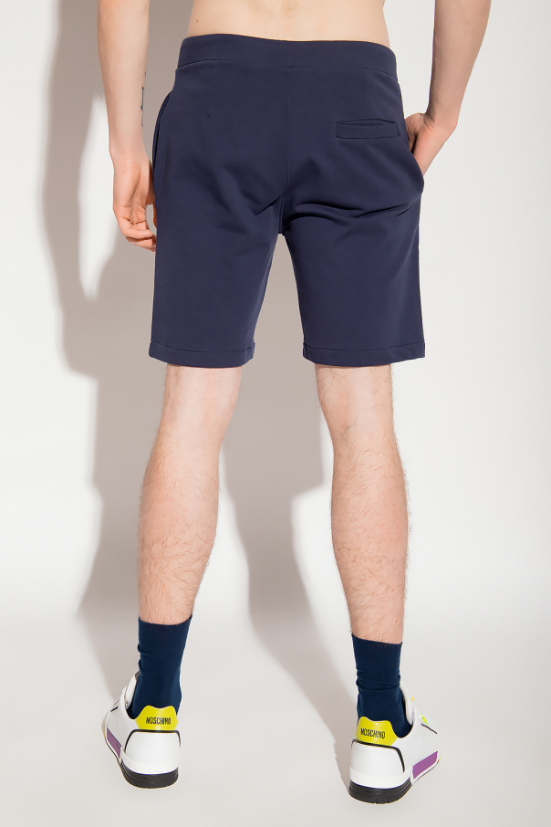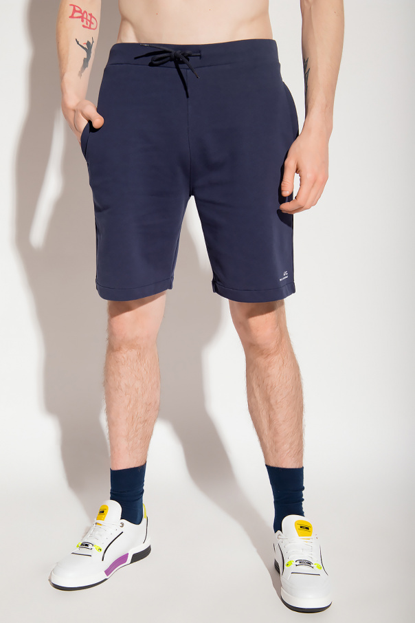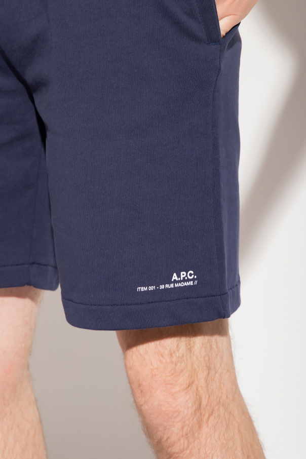 Navy shorts from A.P.C. Crafted from cotton, this pair features an elastic waistband with drawstrings, printed logo pattern in white and three slip pockets.