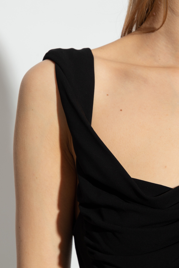 Black maxi dress from Saint Laurent. Enriched by all-over draping, this style features an asymmetrical neckline with a twisted strap and a hidden side zipper with a hook & eye closure.