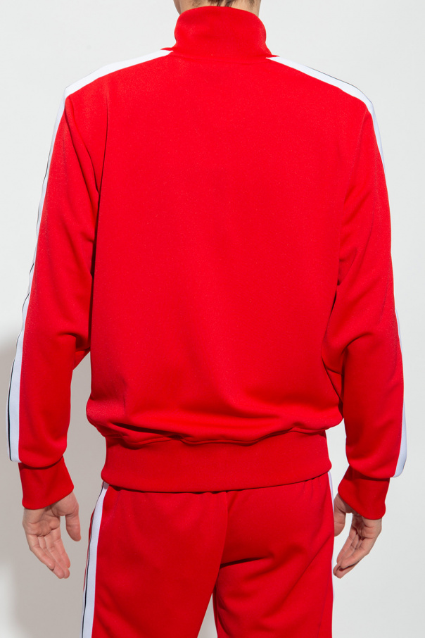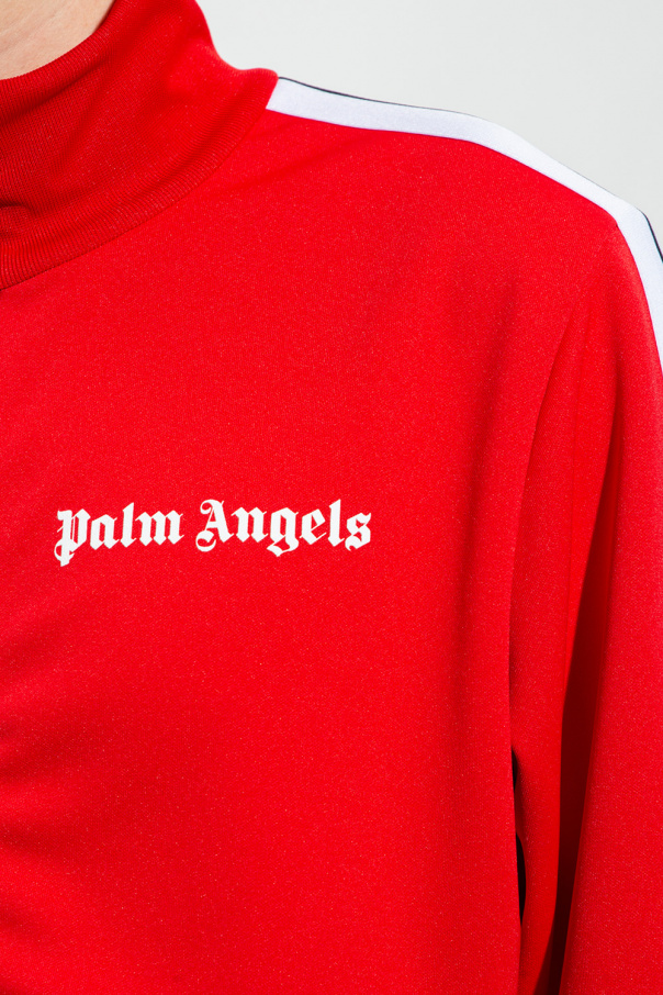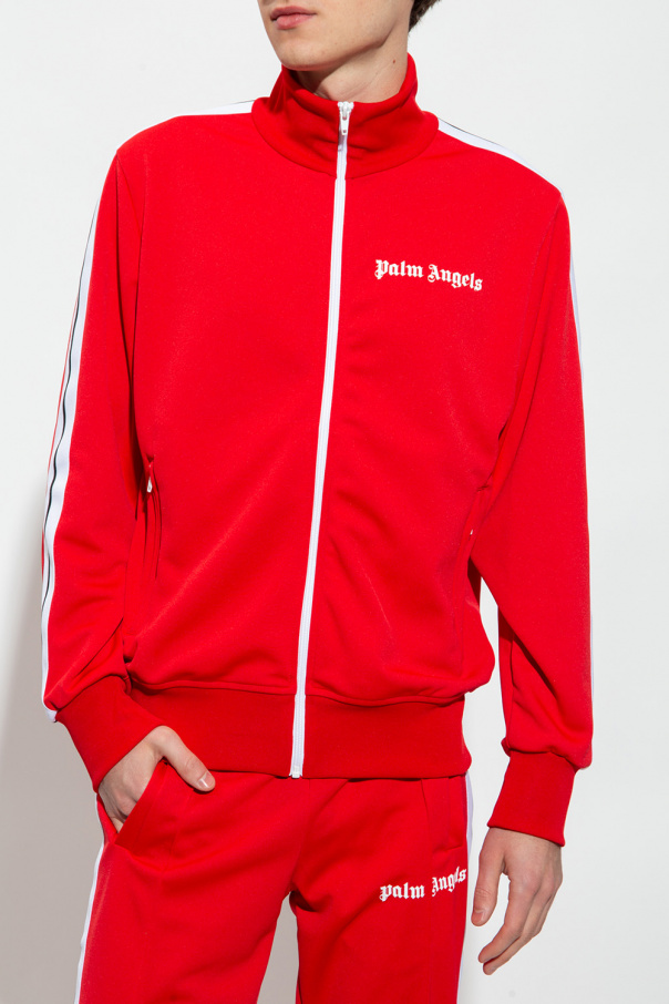 Red track jacket with a high neck from Palm Angels. Fastened with a zip, this garment features a white logo print, two zip pockets, white and black stripes at the sleeves and ribbed trims at the neck, hem and cuffs.