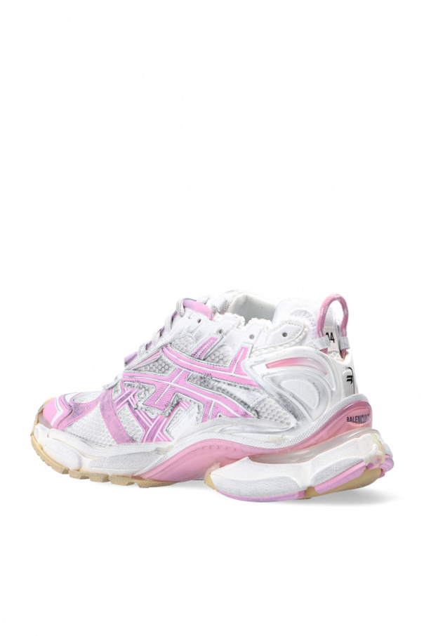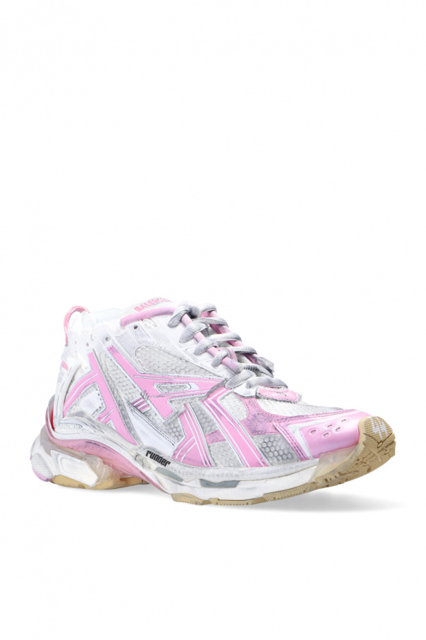 White, grey and light pink ‘Runner’ distressed sneakers from Balenciaga. Featuring a mesh upper, this pair is complete with a logo-embroidered tongue, raw cut edges, vintage effect and rubber sole in white, beige and light pink with transparent inserts.