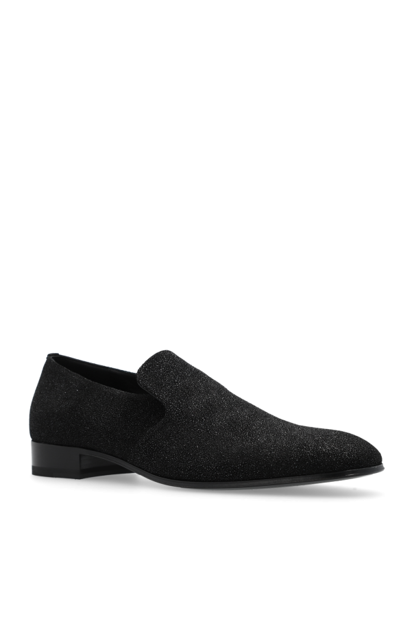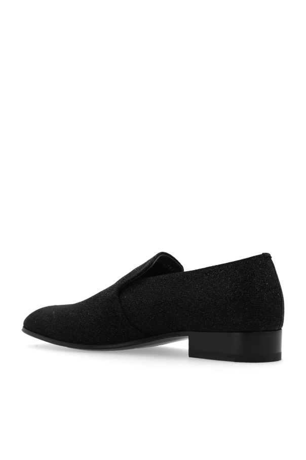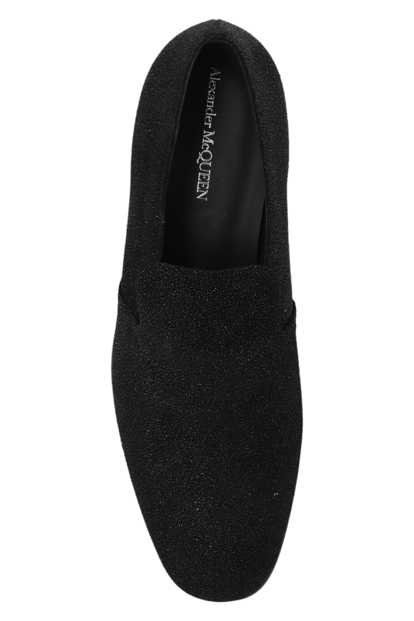 Black slip-on shoes from Alexander McQueen. Made of leather, this pair features a shiny insert and black leather sole.
