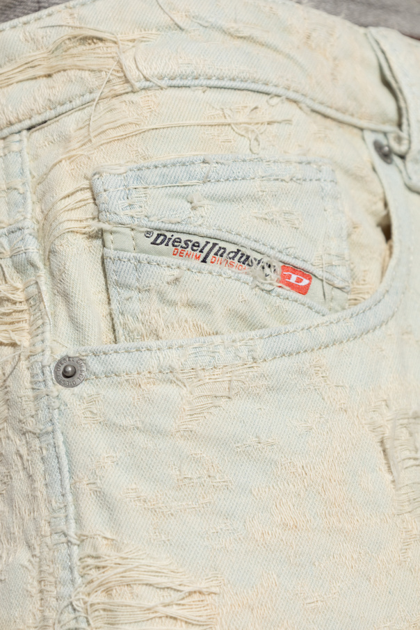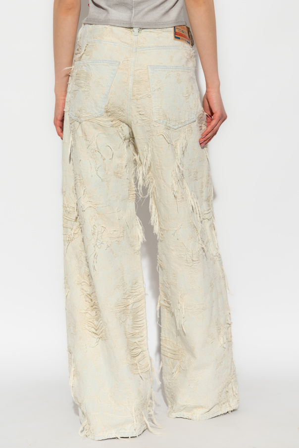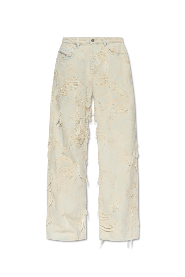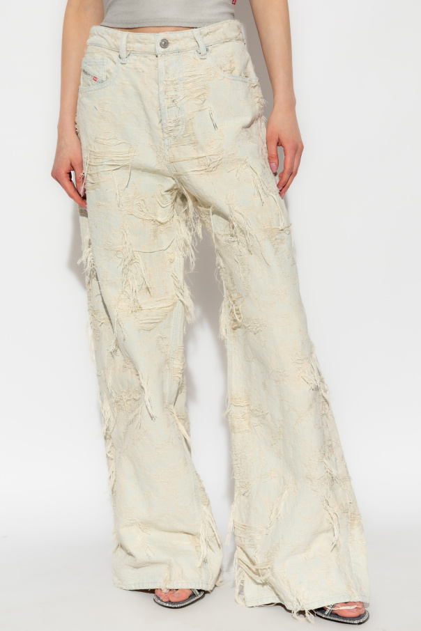 Exude effortless sophistication with the 1996 D-SIRE-FSG jeans from Diesel\'s exclusive collection. These jeans are the epitome of refined vintage charm, boasting a bootcut silhouette with wide legs that offer a relaxed yet polished fit. Crafted from premium 100% Cotton, the fabric emulates a distressed, aged appearance, adorned with artful frays and rips that evoke a raw, retro allure. The light blue hue imparts a fresh, subtle elegance, while the small front pocket proudly displays the iconic \"Diesel Industry Denim Division\" patch, complemented by the classic Diesel logo patch on the back waistband. Dlaczego warto kupić ten produkt? Unique vintage-inspired design perfect for urban fashion enthusiasts. Premium quality from the renowned Italian brand, Diesel. Distinctive details such as the signature Diesel patches. Button closure for a secure and classic fit.
