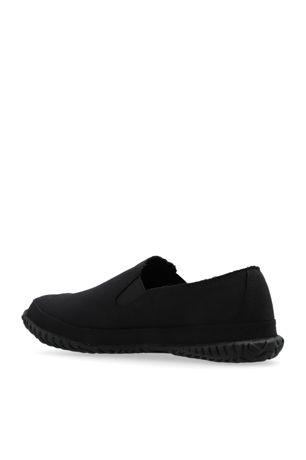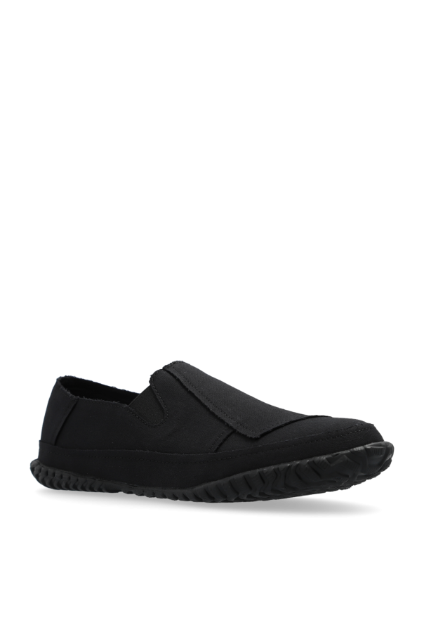 Black shoes from Yohji Yamamoto. Made of cotton canvas, this lace-up pair features asymmetrical patches, raw trims and a black rubber sole.