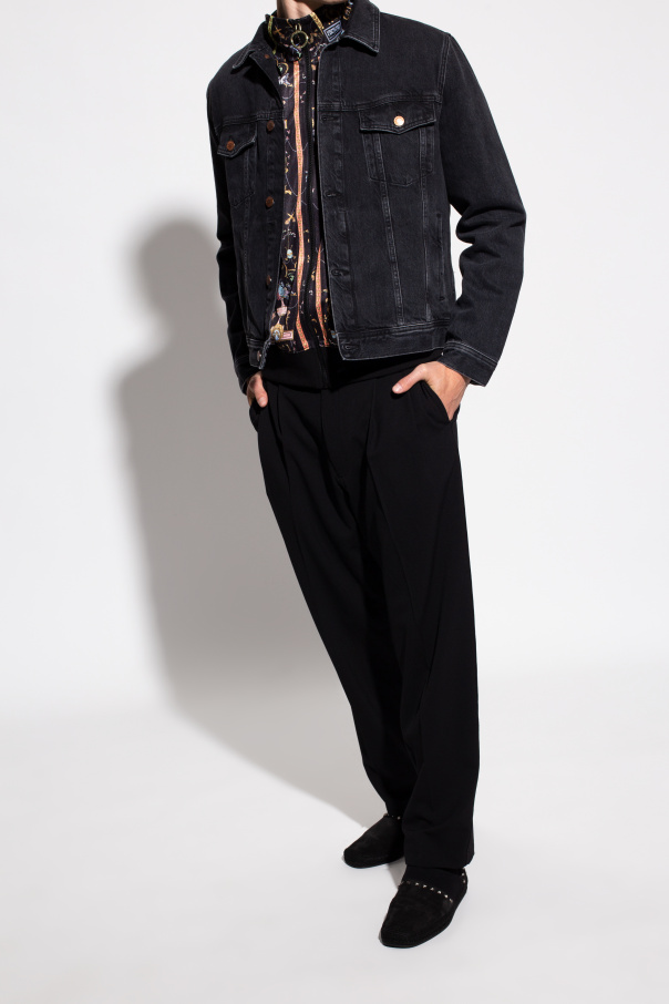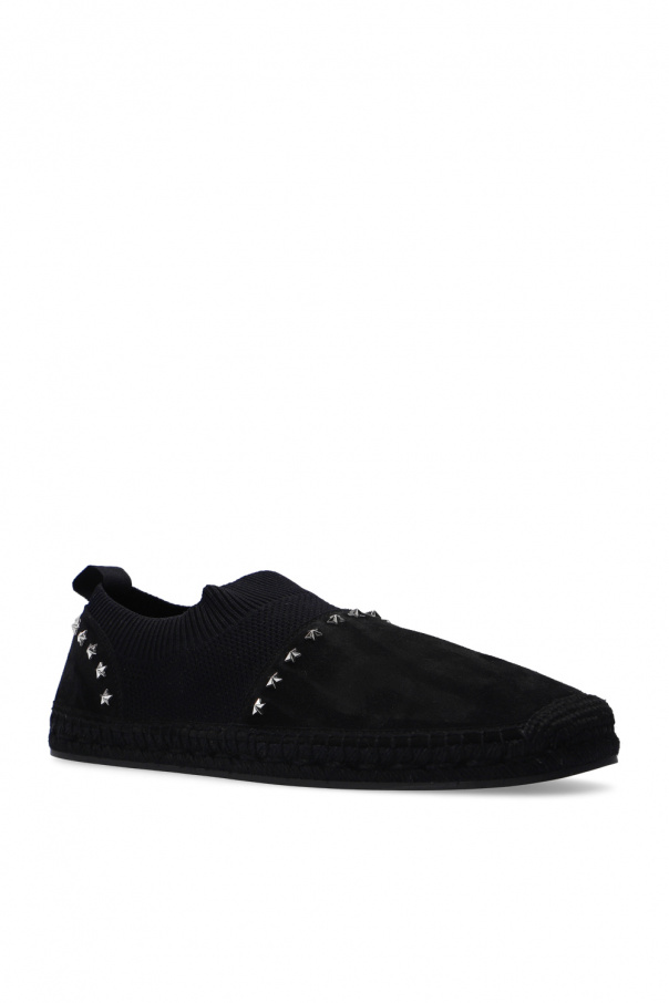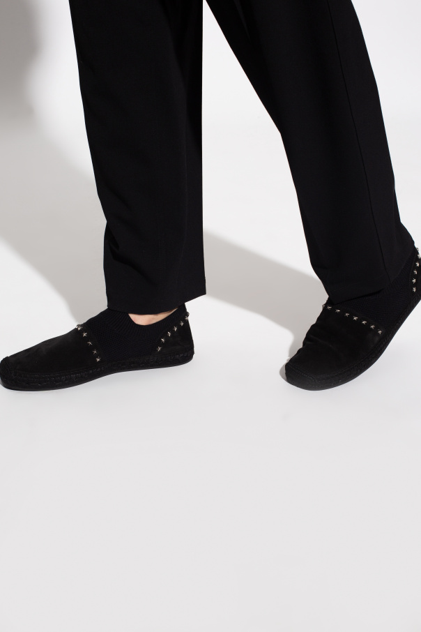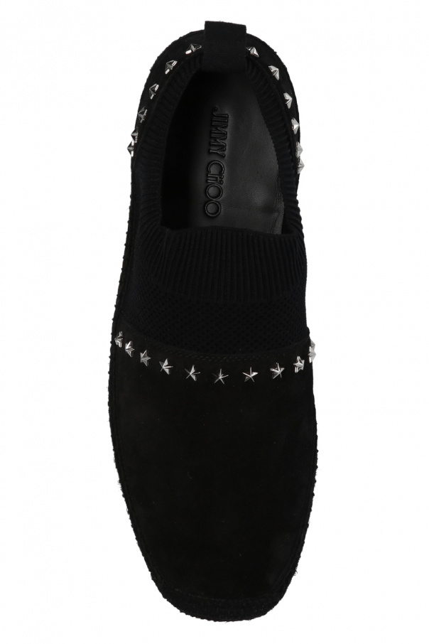 Black 'Enzo' espadrilles from Jimmy Choo. Made of suede with a slip-on silhouette, this pair sits on a black rubber sole and features a knit edge and silver-tone embellishments.