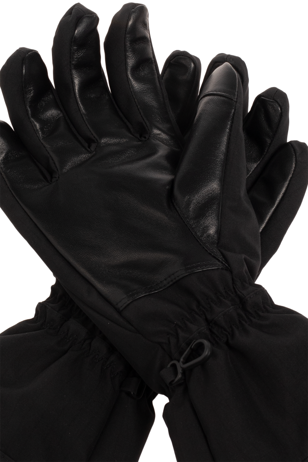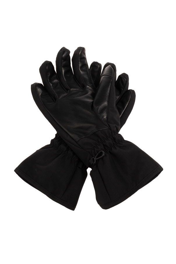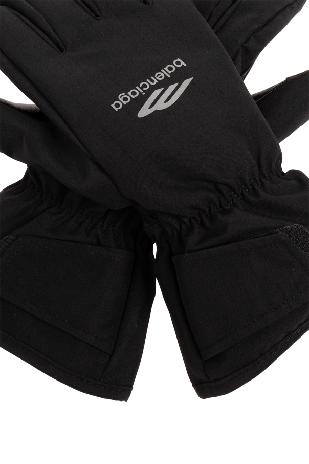 Black ski gloves from Balenciaga, the ‘Skiwear’ collection. Made from technical ripstop materials and reinforced with black lamb leather, this model showcases a printed reflective logo, fleece lining as well as ribbed cuffs and velcro closures. Both items are connected via a lobster clasp.