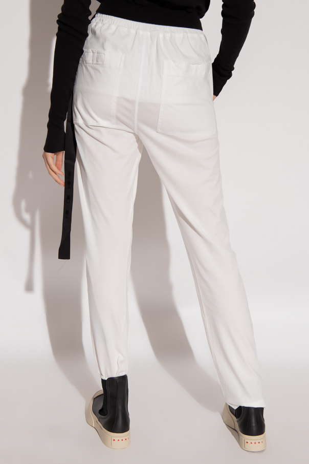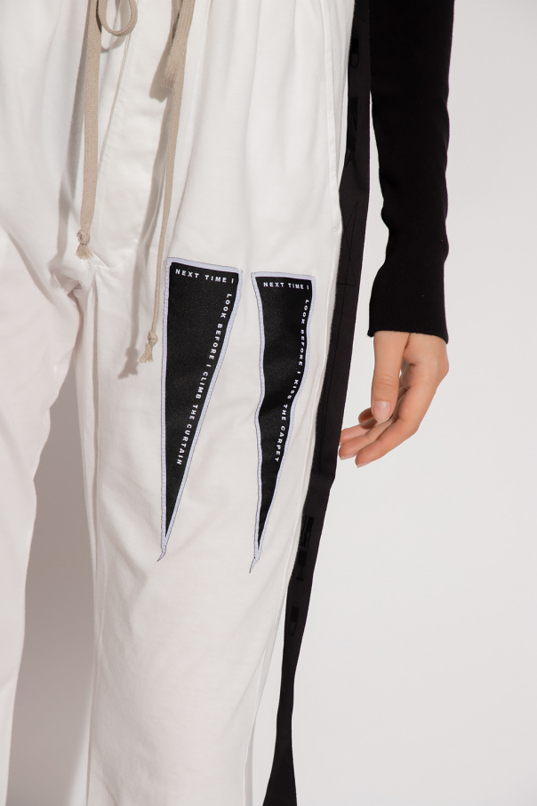 White sweatpants from Rick Owens DRKSHDW. Made of cotton, this pair features an elastic waistband with drawstrings, black patches, two front pockets, two velcro-fastened back pockets and slightly tapered legs.