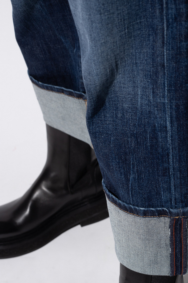 Navy ‘D-Reggy’ jeans from Diesel. Made of cotton, this pair features zip fly and button fastening, five slip pockets,straight legs with turn up cuffs and a beige patch printed with a logo pattern.
