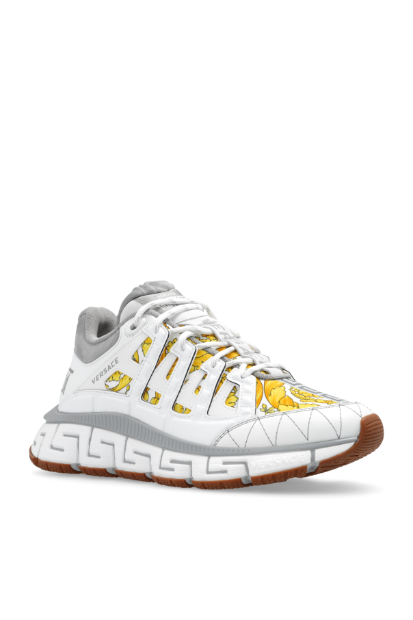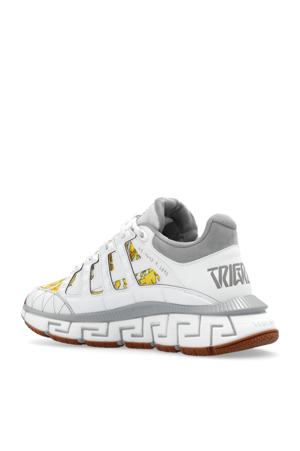 White and grey ‘Trigreca’ sneakers from Versace. Crafted from leather and fabric, this lace-up pair features the brand’s signature Greek, Baroque and logo motif, Milan’s coordinates printed on the side and rubber sole in grey, brown and white.