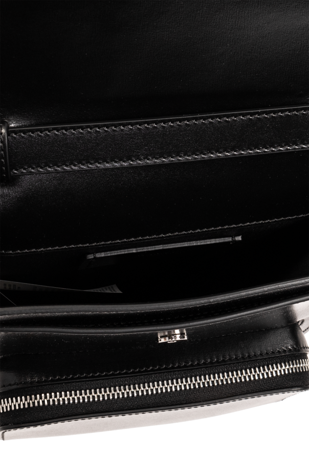 Black shoulder bag from Versace. Made of calf leather, this model features a snap closure, zipped front pocket, logo pattern, adjustable shoulder strap, silver-tone metal hardware and one internal compartment with one slip pocket.