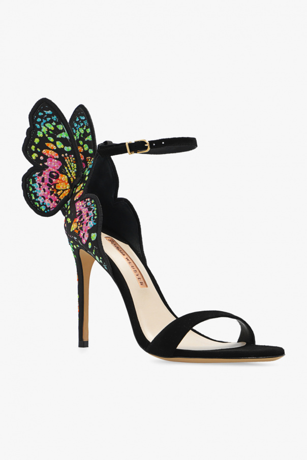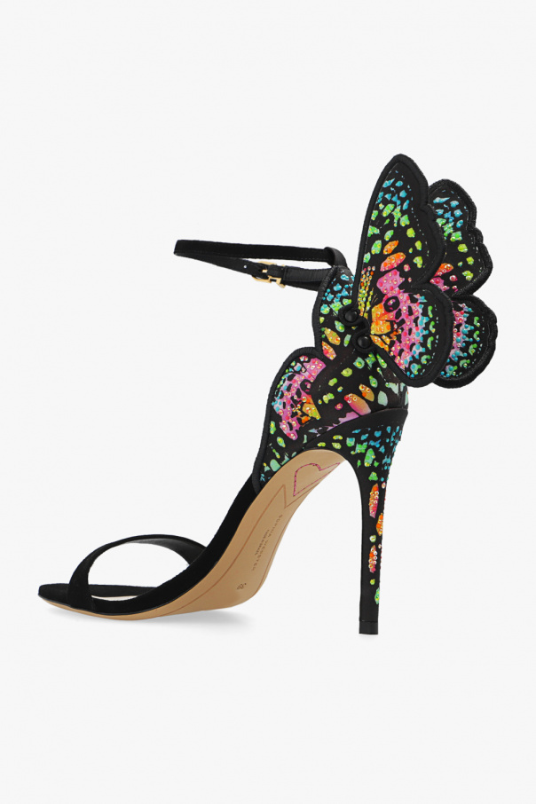 Multicolored ‘Chiara’ heeled sandals from Sophia Webster. Crafted from leather and fabric, this pair is complete with a buckled ankle strap, pattern embellished by crystals, decorative butterfly wing appliqués and beige leather sole with the label’s signature heart embroidery.