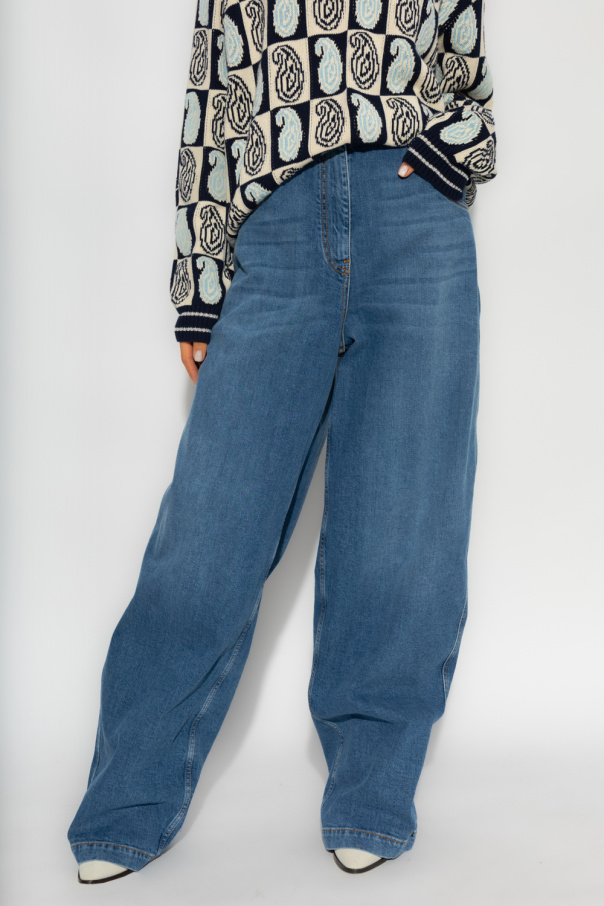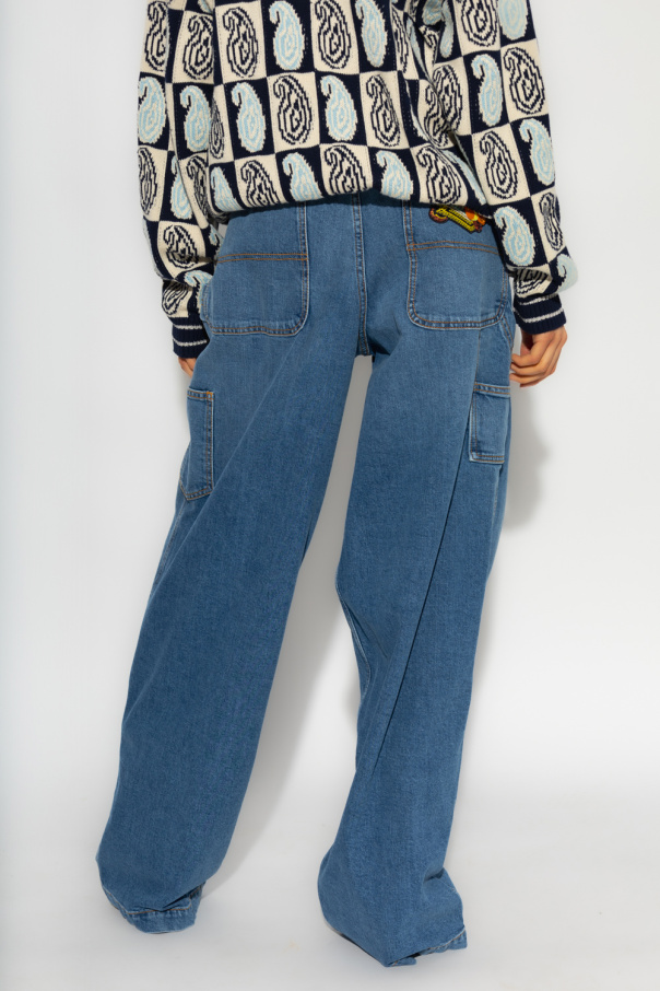 Blue baggy jeans from Etro. Emblazoned at back with a colourful logo patch, this pair features a zip fly with a button and classic five pockets.