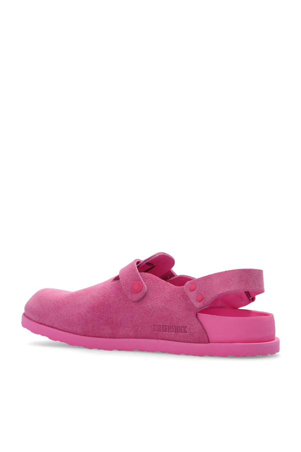 Pink \'Tokio II VL\' slides from Birkenstock 1774. Crafted from suede, this model sits on a pink EVA foam sole and features an embossed logo on the side and adjustable straps on the front and back. Regular width.