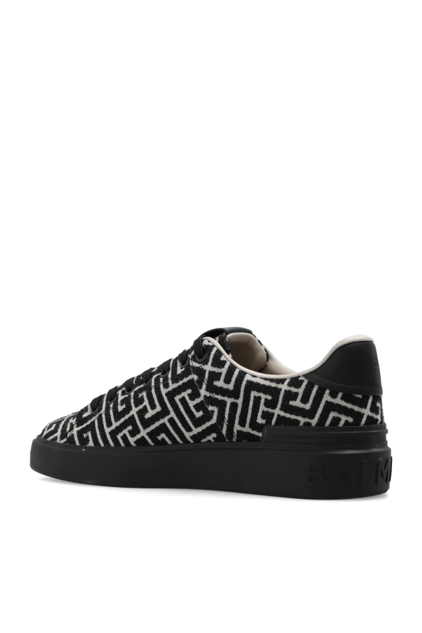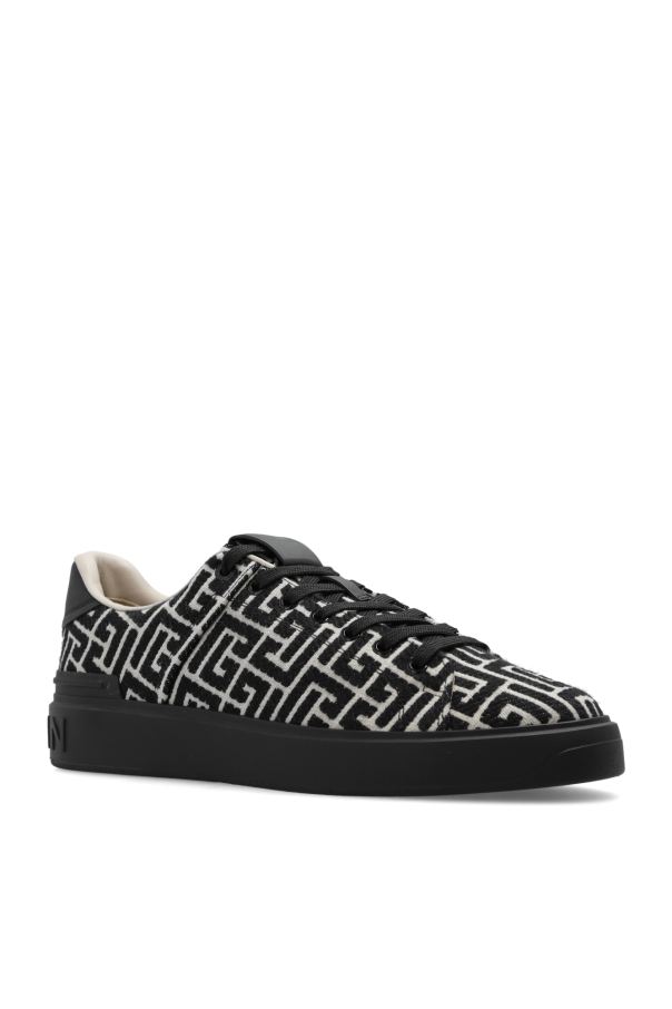 Cream and black ‘B-Court’ sneakers from Balmain. Resting on a black rubber sole, this lace-up pair is decorated with a monogram pattern and logo.