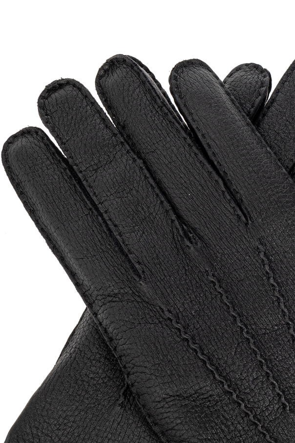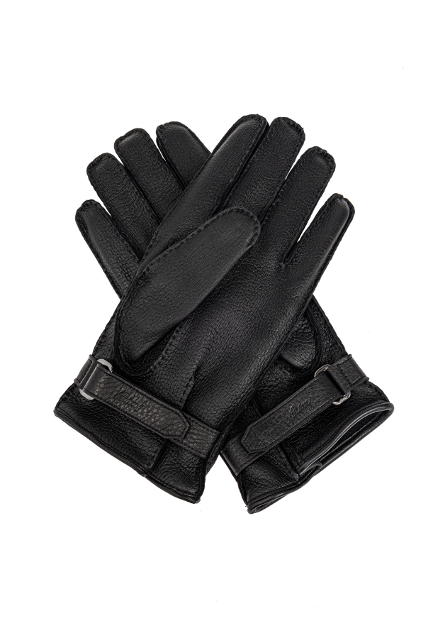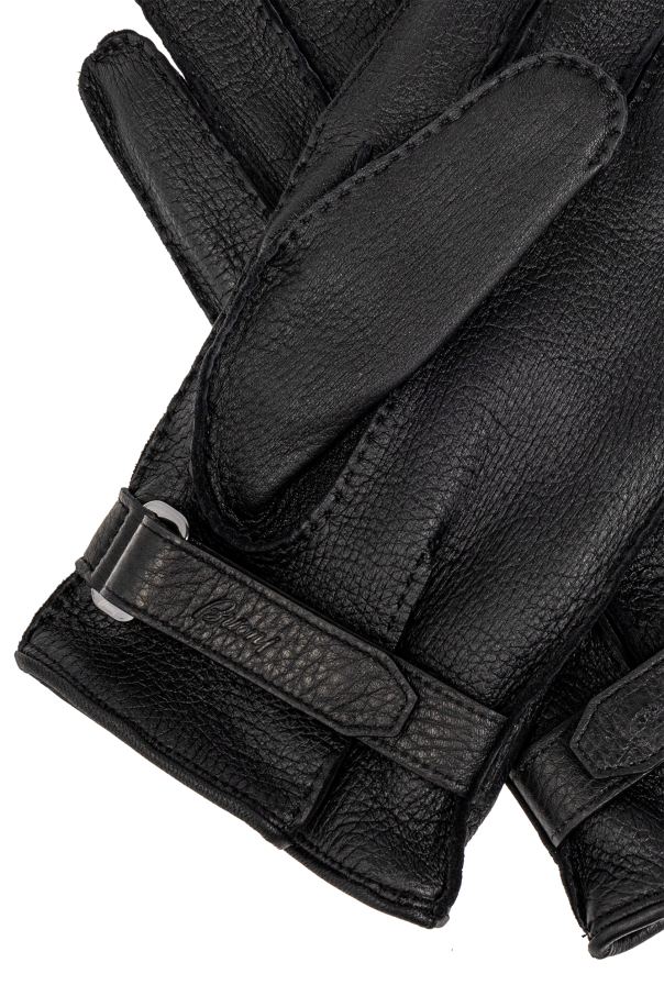 Black gloves from Brioni. Made of leather, this pair features a strap with a silver-tone buckle and is decorated with an embossed logo.