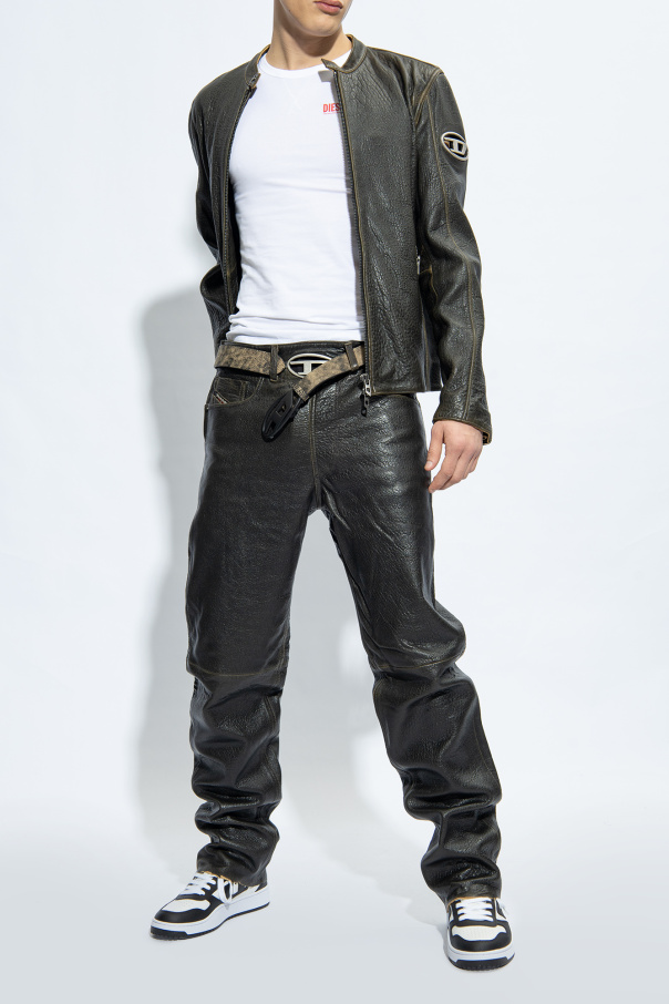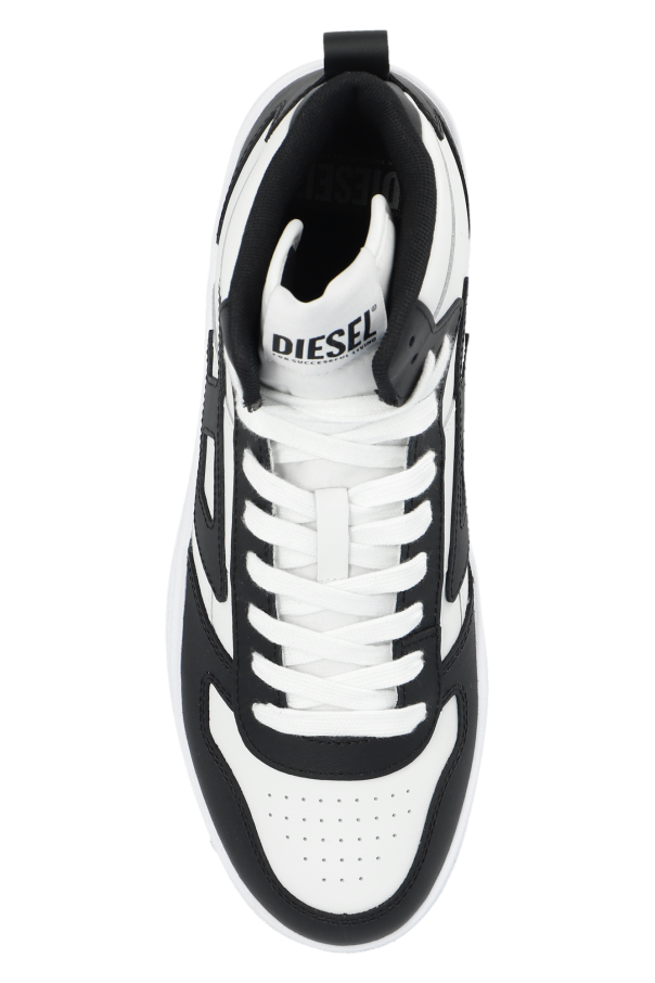 White and black ‘S-UKIYO V2 MID’ sneakers from Diesel. Made of smooth leather with a high-top silhouette, this lace-up model sits on a black and white rubber sole and showcases the brand\'s logo and perforations.
