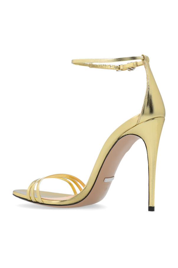 Gold-tone heeled sandals from Gucci. Made of leather with a metallic finish, this pair fastens with a buckled ankle strap and is set on a blush pink leather sole.