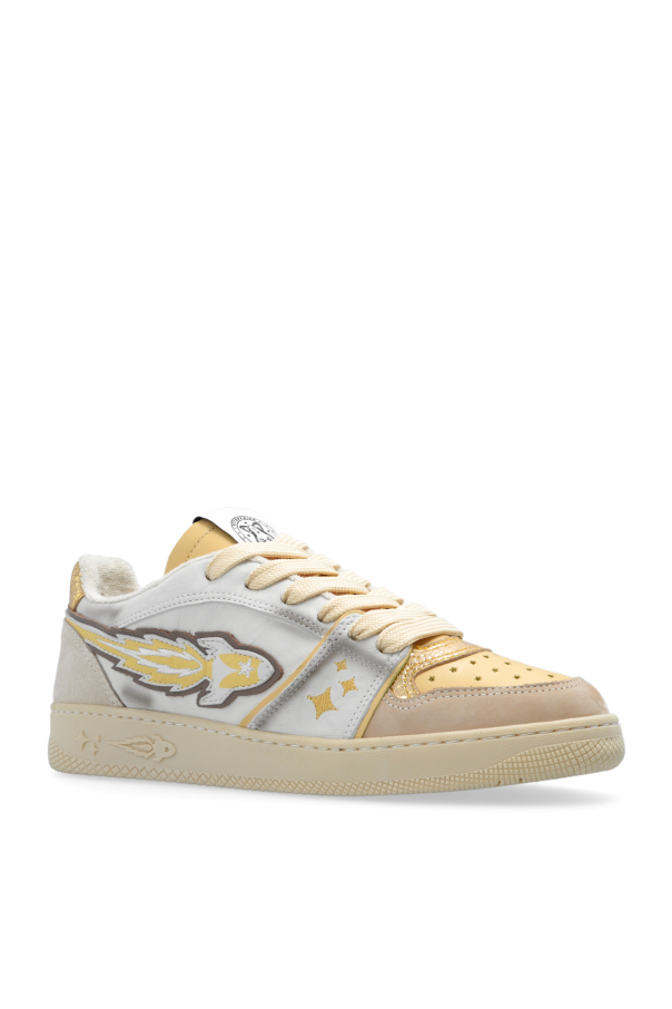 White, beige and yellow ‘EJ Egg Rocket’ sneakers with a vintage effect from Enterprise Japan. Resting on a cream rubber sole, this lace-up pair features a patch and embroidered logo motif as well as gold-tone trimming.